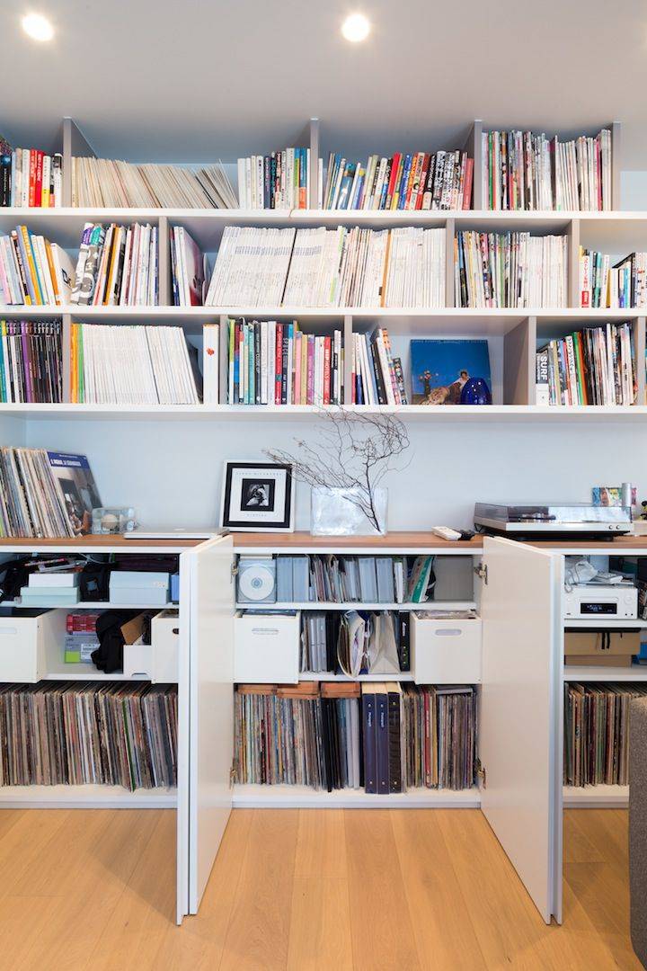 インテリア関係の雑誌やレコードがたくさん。雑誌もたくさん集まるとかなりの重量ですが、備え付けの造作家具で収納を作り、壁には下地を入れてしっかりと固定しています。