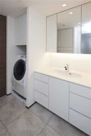 洗濯機の上は使わないと勿体無いスペース。扉付きの収納スペースを造り、洗剤やタオルなどを収納すると便利ですし見た目も散らからずに美しく保てます。