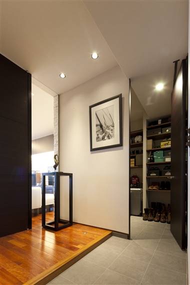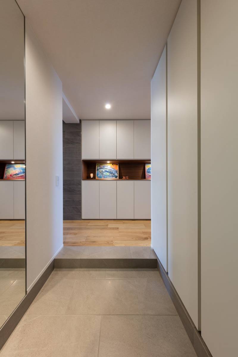 横の広がりを感じさせるためには鏡が効果的です。上の写真のように周りにフレームを付けたり鏡をいくつかに分けたり、オリジナルの鏡をデザインすることももちろん可能です。既製品の鏡では高さがぴったりとは合いませんが、造作で造る場合には床から天井までぴったりの高さで造ることができ、より玄関を広く見せることができます。