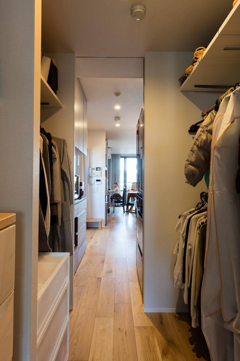 寝室からウォークインクローセ゛ットそしてキッチンへとつなか゛っており、毎日の室内の行き来を楽にしました。快適な動線からストレスのない暮らしが生まれました。