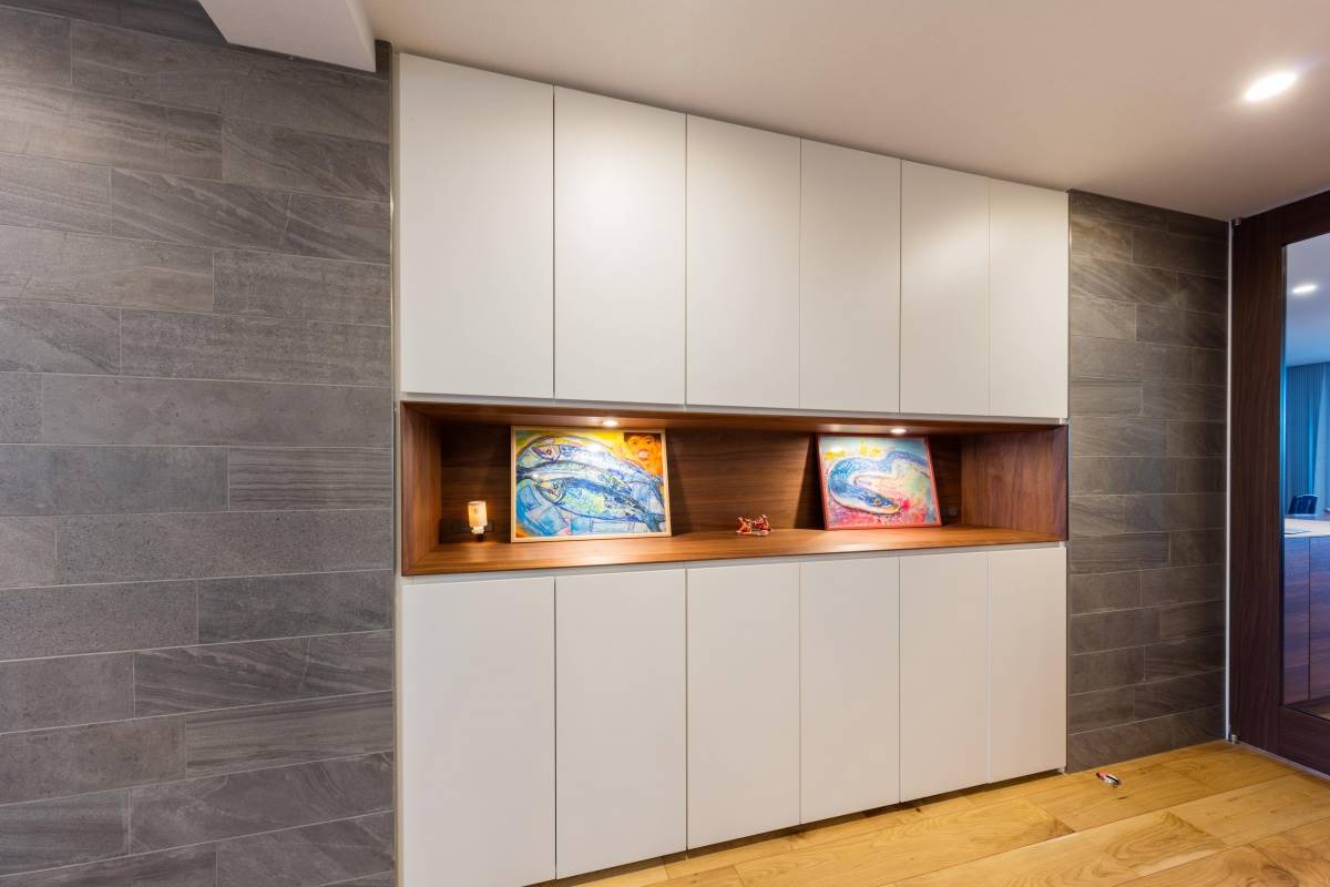 玄関にはアイキャッチとなる飾り棚兼収納棚をデザイン。引き手や部材の切り替え部分など、細部のデザインにもこだわりました。