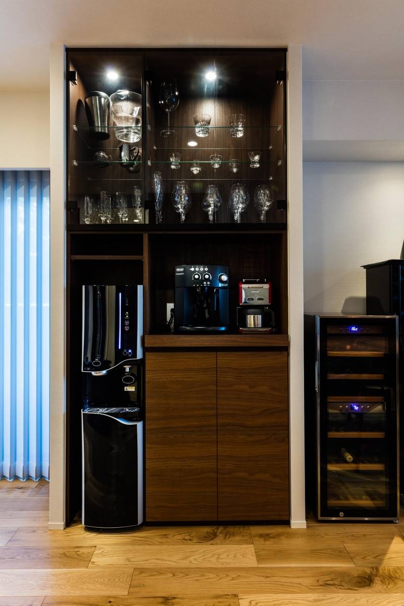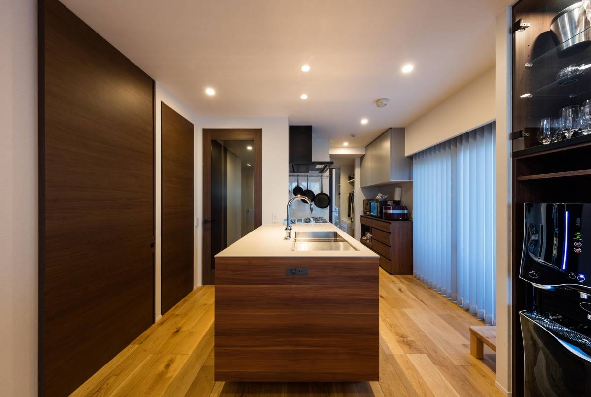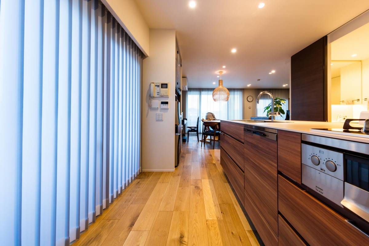 カラーは家具と建具をシックなウォルナットに、床をそれよりも明るいオークで仕上げました。色のコントラストがはっきりとしているのでぼやけたイメージにならず、メリハリがついたモダンな雰囲気に仕上がりました。