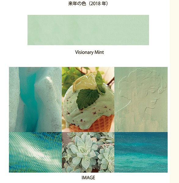 日本流行色協会(JAFCA)は、2018年のトレンドカラーとして選定した色を「ビジョナリーミント」と称しました。Visionary ビジョナリーとは、「将来を見通した、想像力のある」などの意味を持つ言葉で、混迷を極める時代に風穴を開けて、明るく、爽やかに進んでいきたいという気持ちを込めて、このミントグリーンを選定したそうです。