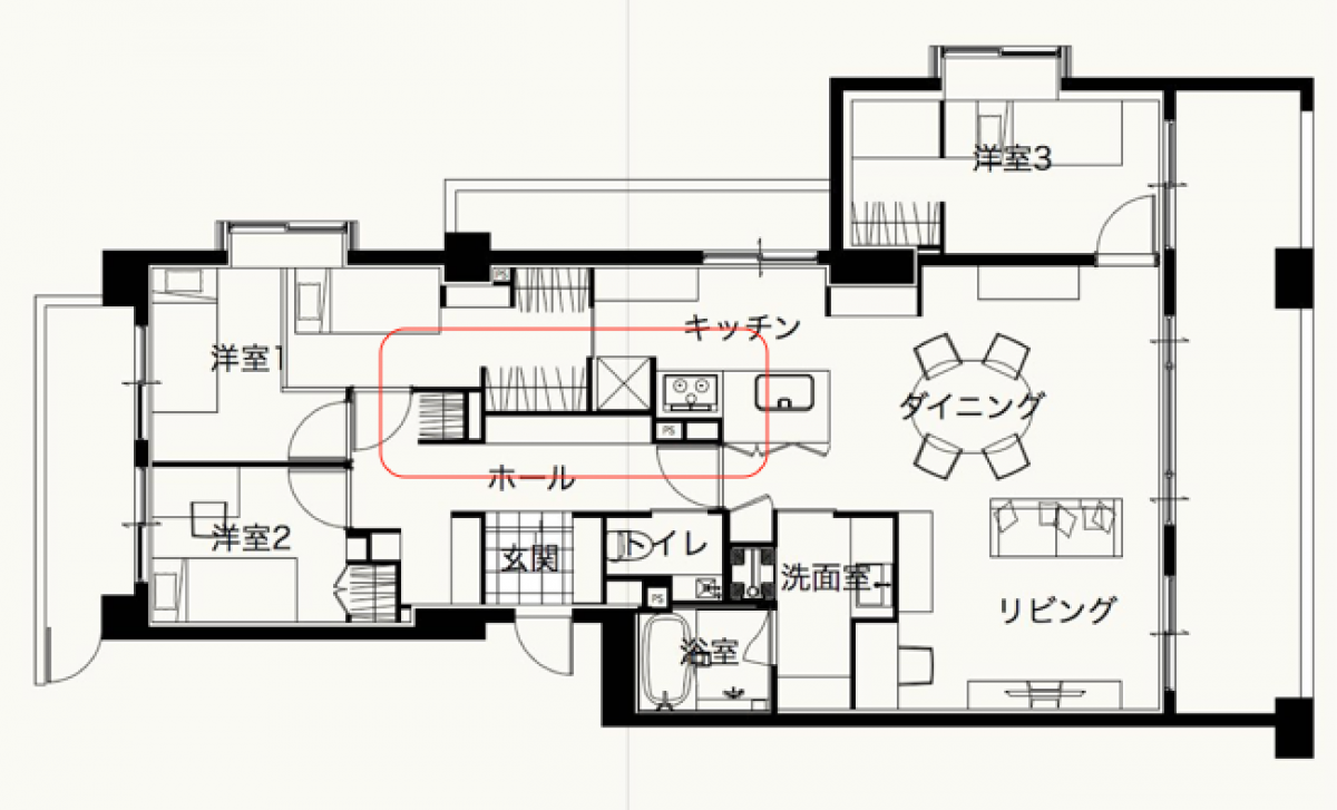 回遊性を重視するプランにおいてウォークスルークローゼットはとても重要です。いかに「行き止まり」の空間を避けるかによって視覚的にも動作的にも広がりが生まれ、広さの割には狭く感じる、という新築マンションにありがちなウィークポイントを改善することができるのです。