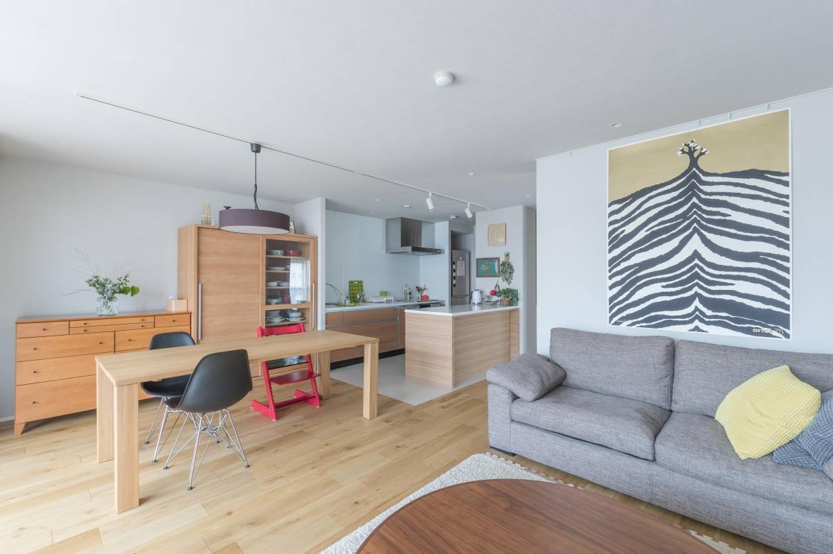 キッチンとダイニング、リビングが一つの空間に。キッチンでお料理をするお母さん、ダイニングで宿題をする子供たち、リビングでくつろぐお父さん。それぞれ別のことをしていても家族の気配が感じられ、つながりが生まれます。