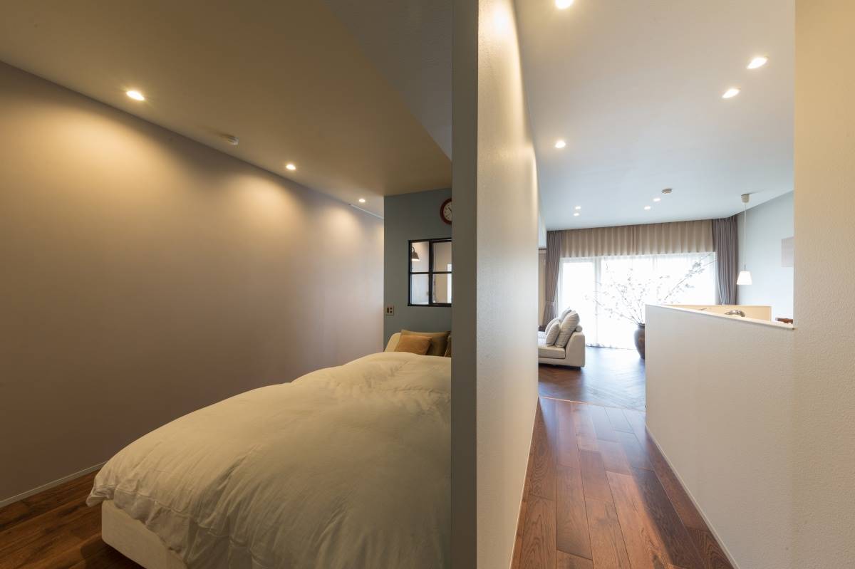 寝室の壁は間仕切りっぽくしました。建具がないことで空間が広々と感じられます。