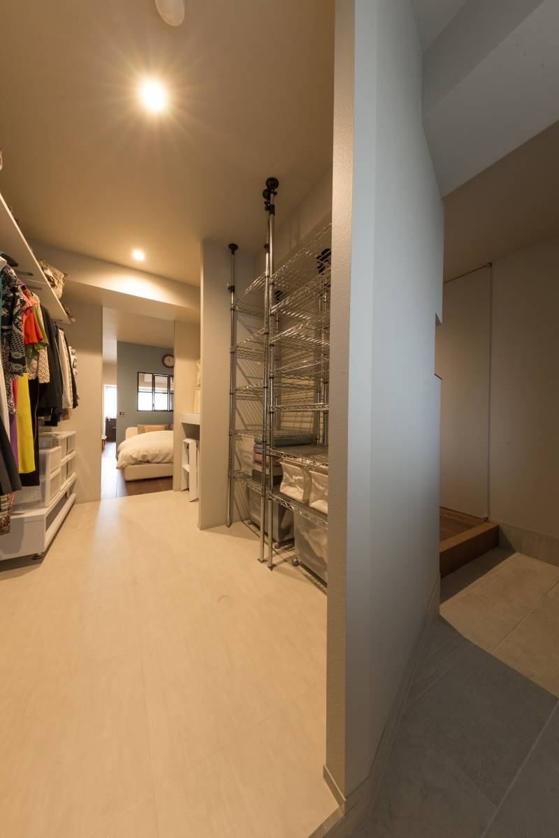 ウォークスルークローゼット。衣類やスーツケース、ストック類、生活雑貨。日々必要な物を全てこの空間一箇所に入れ込みました。
