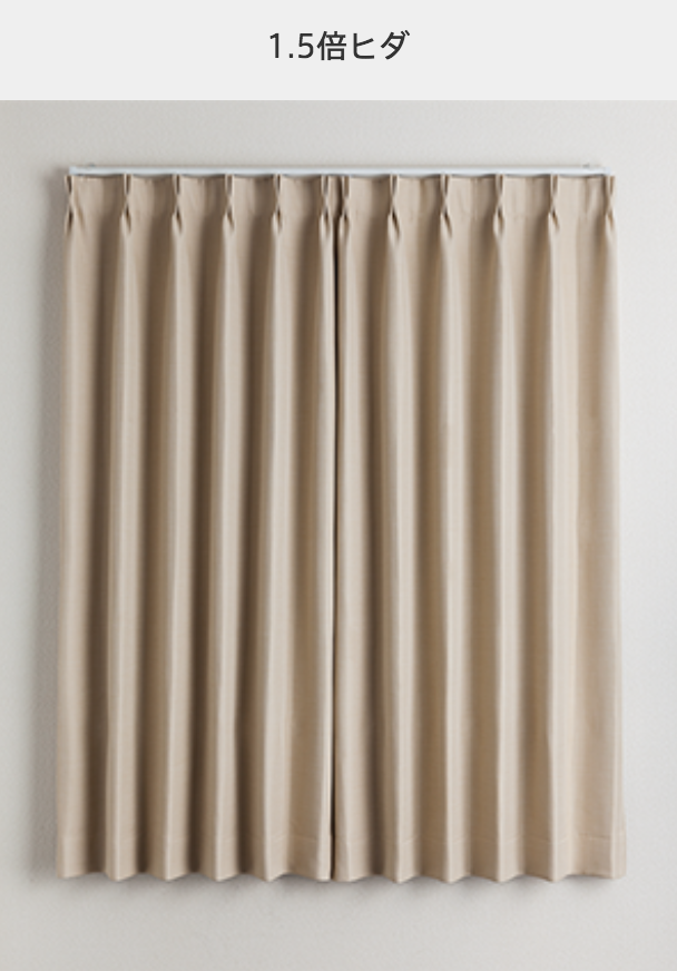 横幅に対して生地を1.5倍使うのか、2倍使うのか、という生地の量でカーテンのウエーブ感が異なります。一般的に既成カーテンは1.5倍程度で、オーダーカーテンはたっぷりと2倍程度の生地を使うため、高級感が感じられます。厚みのある生地は2倍ヒダでも3 つ山ではなくて2つ山になったりと、生地によっても異なる場合があります。2倍と1.5倍とで生地の使用量が違ってきますので、その分価格も変わります。