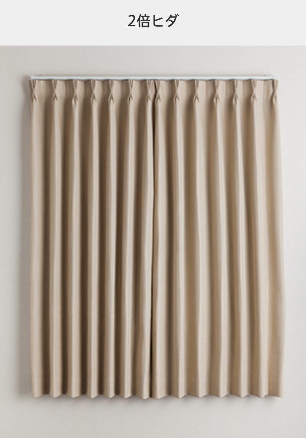 フルオーダーカーテンの標準スタイルです。適度なボリューム感を出すことができます。横幅に対して生地を2倍使うのが標準的です。