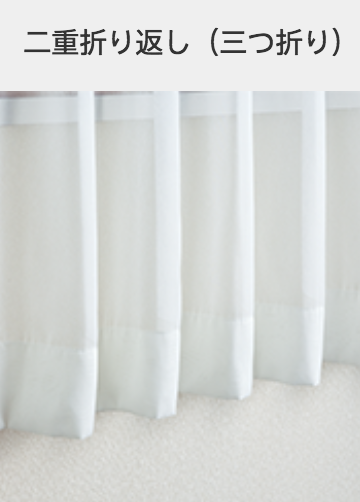 左右に開閉するカーテンも、吊り元(山)や使う生地の量(ヒダ倍率)、裾の仕上げの縫製方法によってもイメージや納まり具合が異なってきます。一般的には3つ山2倍ヒダ、2つ山1.5倍ひだがよく使われています。