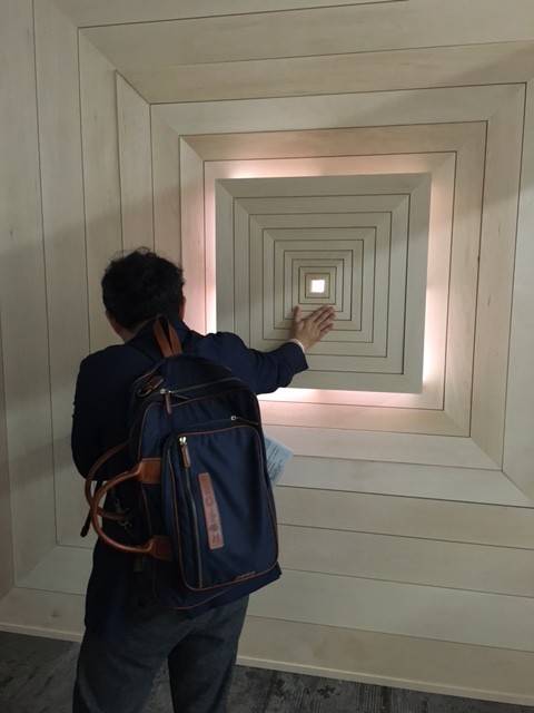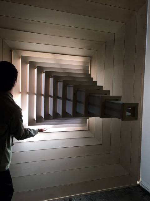 伸びてきました。「建具の縁」というタイトル。縁側を内包したような建具の可能性を追求した作品だそうです。伸びた穴を覗くと小さく小さく外の景色が見えました。