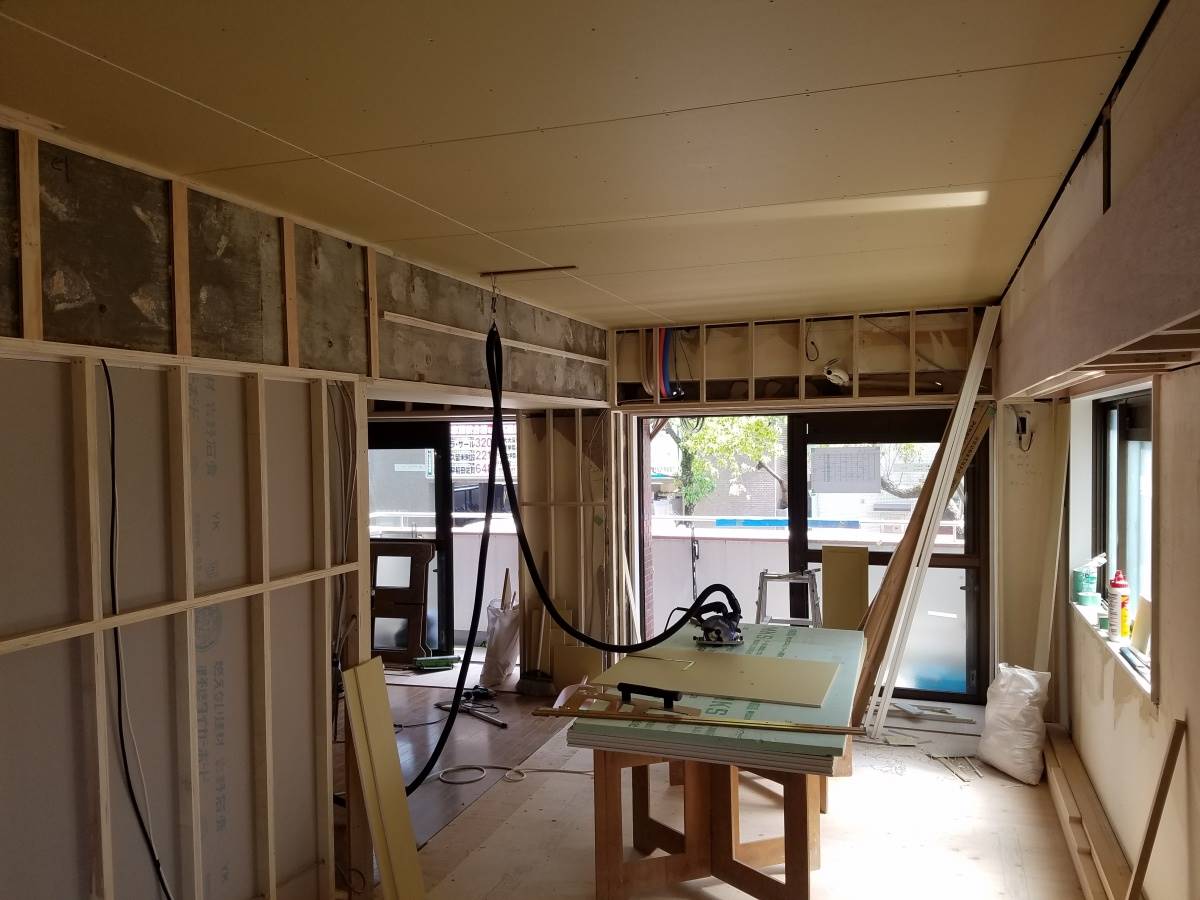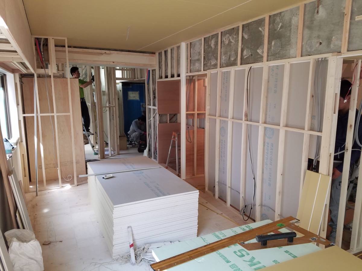 造作工事が進んでいる西新のマンションリノベーションプロジェクト。天井下地、壁下地の造作工事が終わってボード貼りが始まりました。