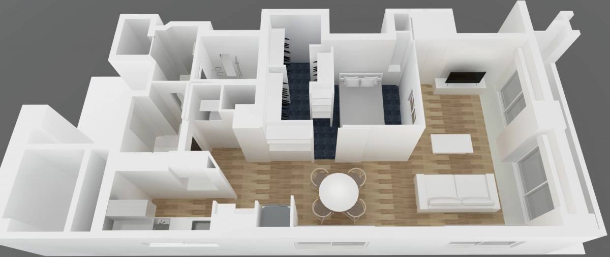 こちらは模型のような平面のCGです。戸建ての新築住宅の打ち合わせでは模型を使って内部のみならず外観や屋根、全体像をご提案するのが当たり前ですが、それを一部マンションのリノベーションでも取り入れてみました。