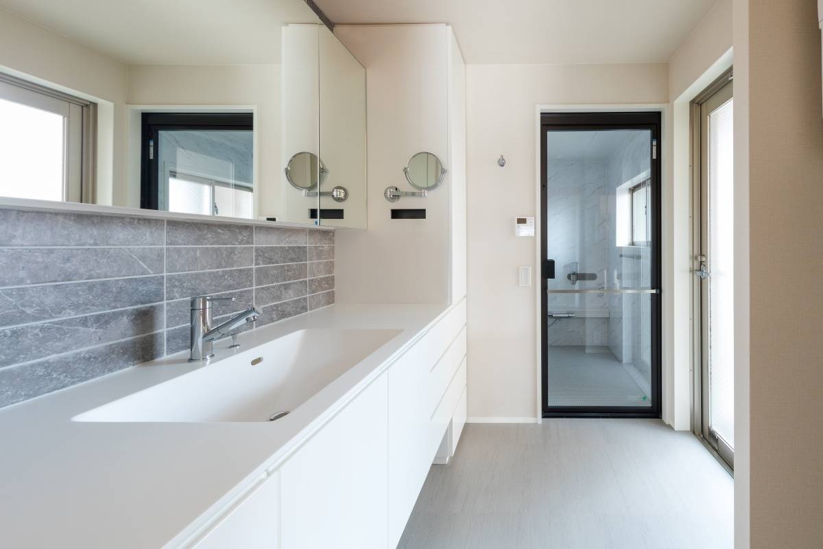 洗面室は白のカウンターに。タイルは名古屋モザイクのビストロイタリアという新しいタイルを使いました。側面にあるのはティッシュが出てくる穴。収納の中にティッシュボックスをおさめて使いやすくしたいという奥様のご要望から、このようなデザインに。ここをこうしたい、こういうのだったら便利、という細かいご要望にお答えできるのは造作家具ならではです。色も大きさも使い勝手に応じて自由に家具をデザインできるというのもリノベーションの大きなメリットや魅力の一つです。ご要望で拡大鏡やバスタオル用フックも取り付けました。