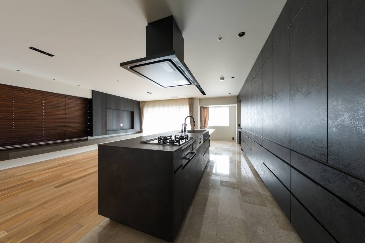 迫力のあるキッチンハウスのキッチンに負けないような存在感のある壁面にする必要がありましたので、テレビボードの素材に徹底的にこだわりました。職人さんにも何度も色出しをしてもらい、最終的にニッシンイクスの黒系の突板を採用いたしました。