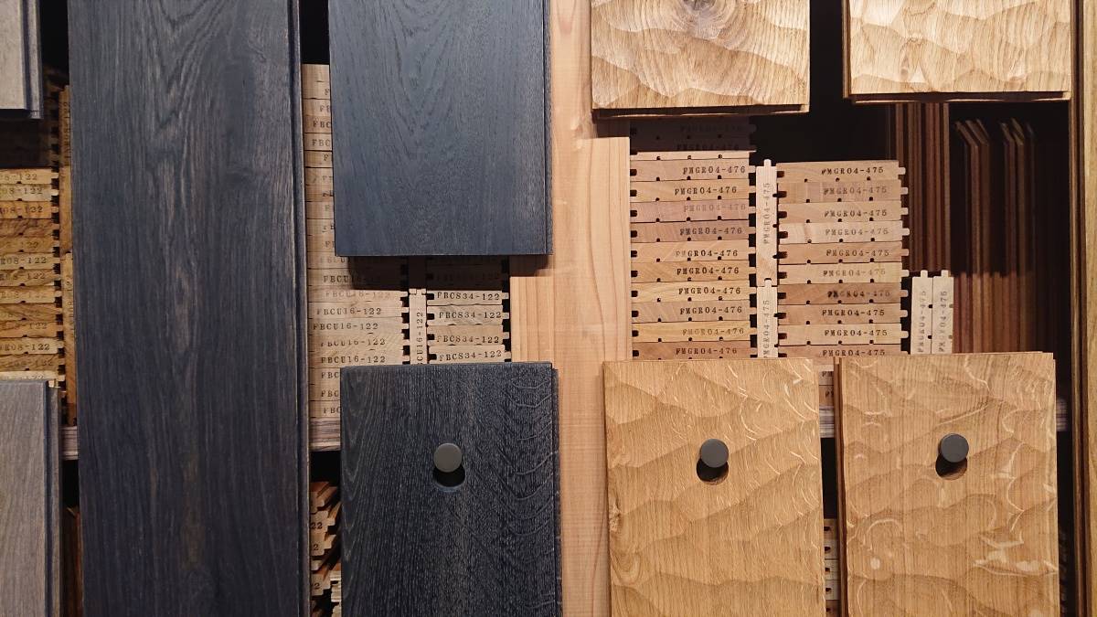 ちなみに、木材サンプルを収納しておくのではなく、壁の一部を使って特徴が強いサンプルをディスプレイしてあるこのブース。