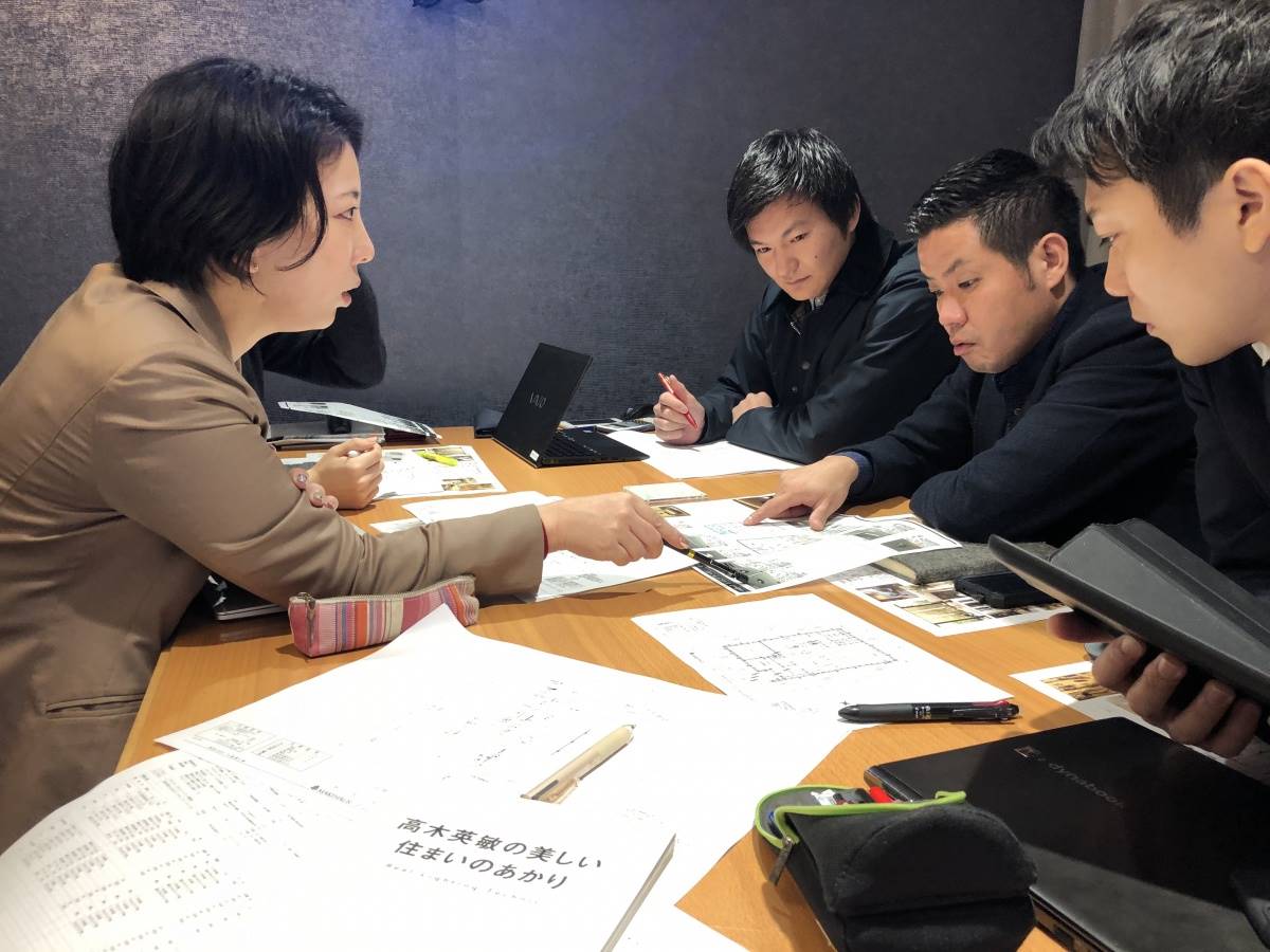 コンセプトが決まってからプランができあがるまで、男性設計士、女性設計士、暮らしのしつらえを考えるインテリアコーディネーター、お客様と一番近い営業というメンバーが集まって、居心地や、機能的に暮らせる動線、照明計画など・・・プロ同士が意見を何度もぶつけあいました。