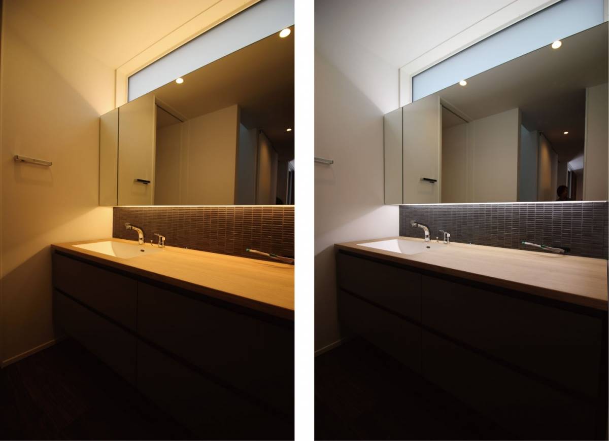 洗面化粧台は雰囲気作りも大切ですが、女性はお化粧をする場所でもあります。電球色ですとお化粧の色が分かりにくいため、写真左のような昼白色にできるようにしておくと、お化粧をするときにも困りません。