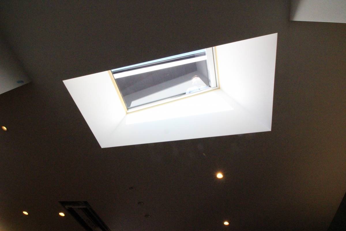 こちらは、室内を明るく照らす天窓。今回、家の計画をするにあたり、二方向を道路に囲まれる角地と呼ばれる敷地いっぱいに建物を建てるため、外からの視線を考慮して窓の大きさや配置を計画しました。その窓の計画を補いつつ、壁面の窓では取り入れることができない、空からの柔らかな光がふりそそぎます。
