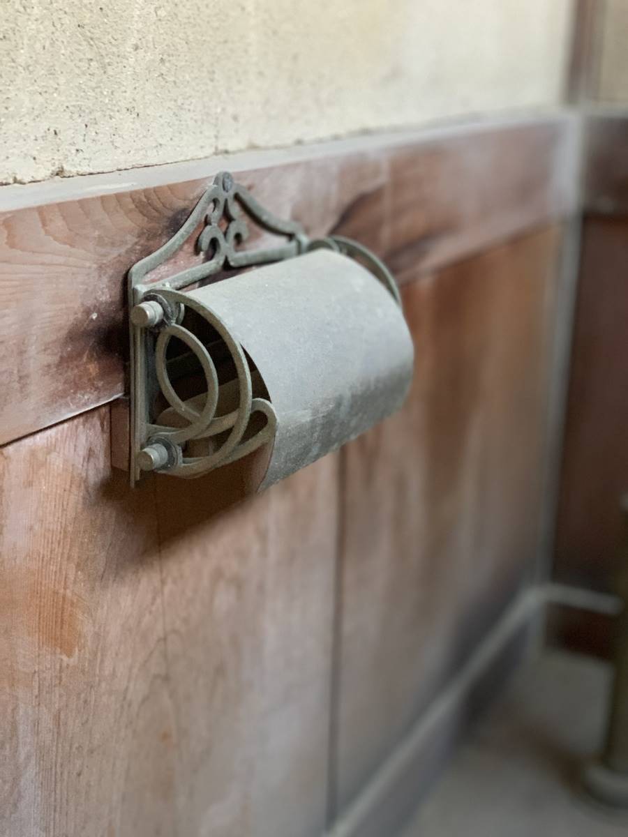 こちらはトイレ外の壁付け式手洗い器。中心にあるのは当時のTOTOのロゴです。調べたところによると昭和3年から36年の間の約30年間、このロゴだったようです。このロゴが刻印された陶器があるというだけで安蔵里がいかに古く貴重な建造物であるかが分かります。背面のタイルは、最近「サブウェイタイル」などという呼び方で流行っているタイルと全く同じですね。目地も薄いグレーでおしゃれ。