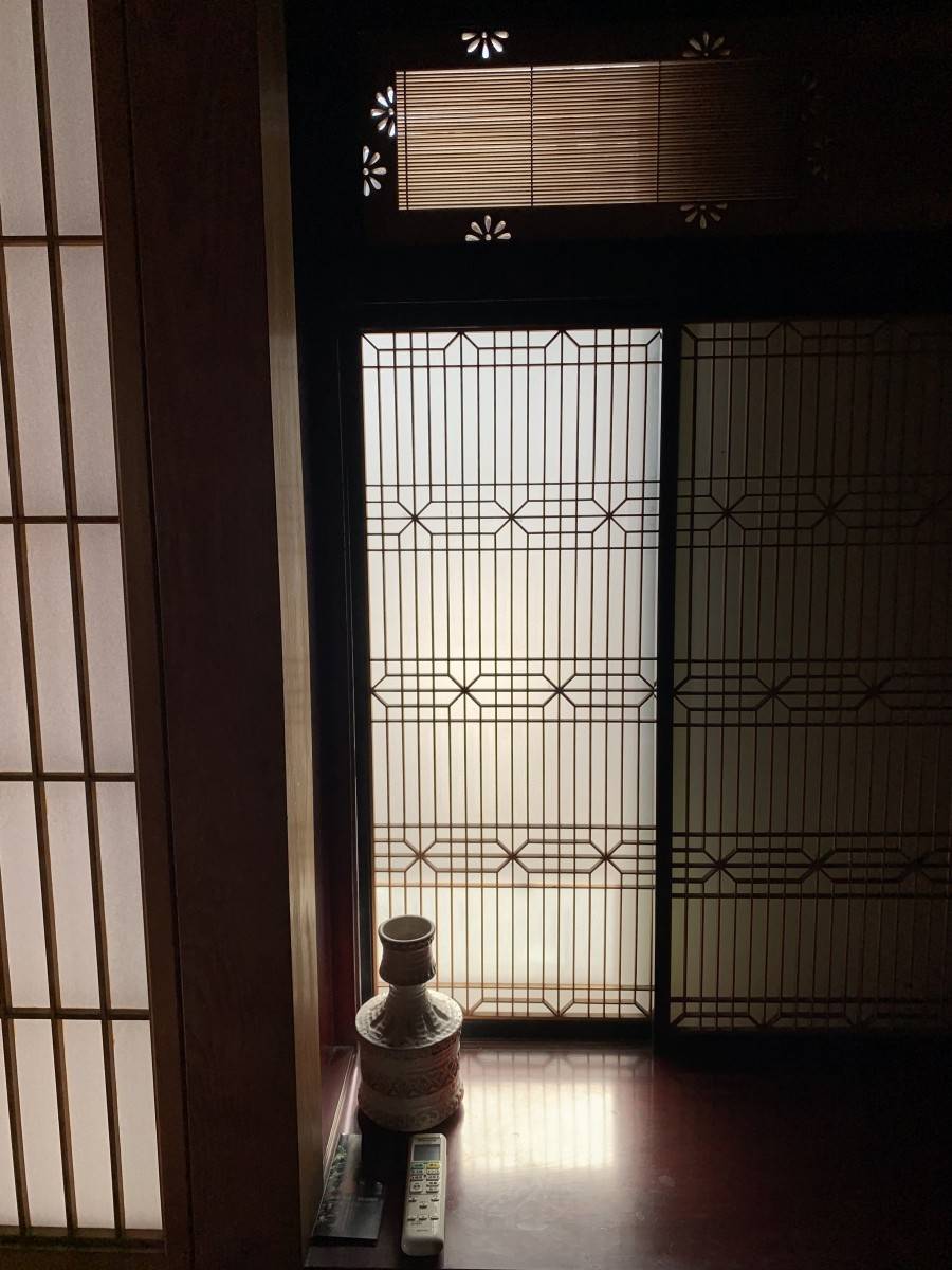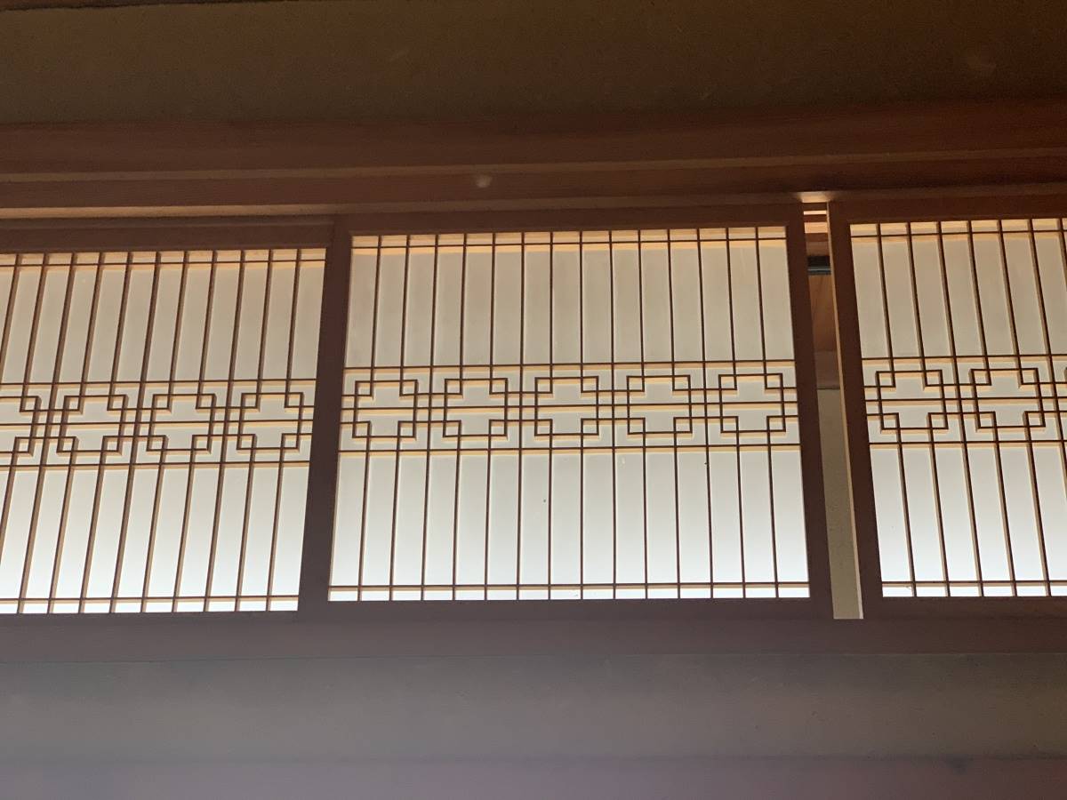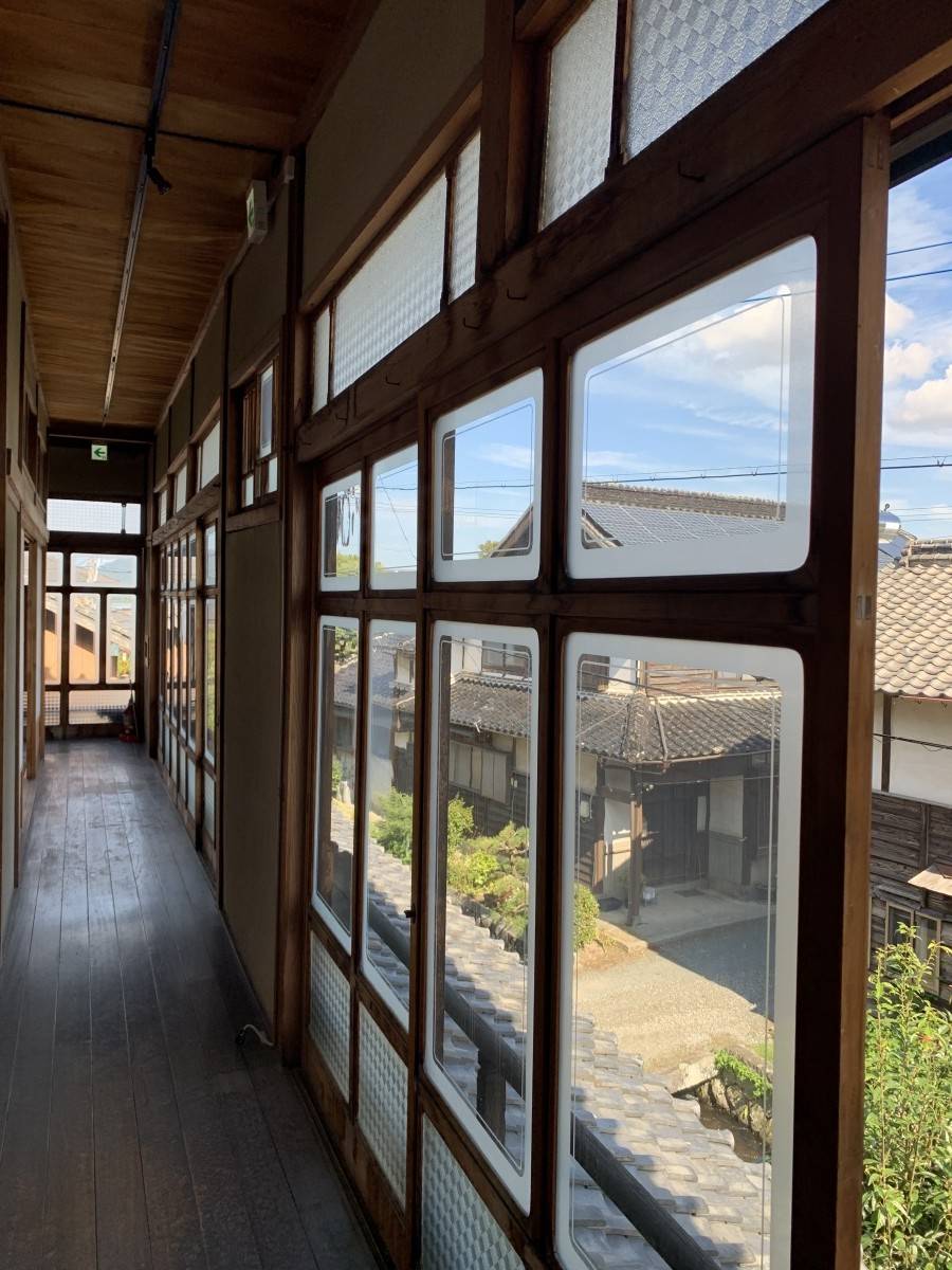 廊下のガラス窓はなんとも言えない美しさ。現在の住宅はいかに外からの目線を遮るかが当たり前の設計ですが、昔は全く逆だったんですね。建築物には外から内への美しい繋がりが重視された時代でした。