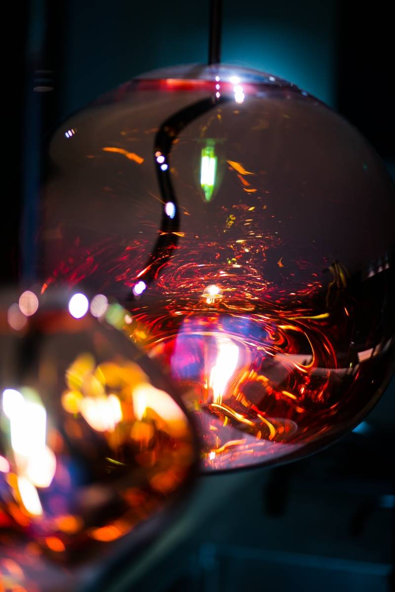 こちらはMELTというランプのシリーズ。カッパー色、ゴールド、スモークの3種類の色があり、大きさも大小2サイズの展開です。ガラスのように見えますが実はポリカーボネート製で、驚くほど軽いです。見る角度によって光り方が変わり、美しい光の陰影を楽しむことができます。物体が溶けているように見えることから、この名前が付いたのだと思います。