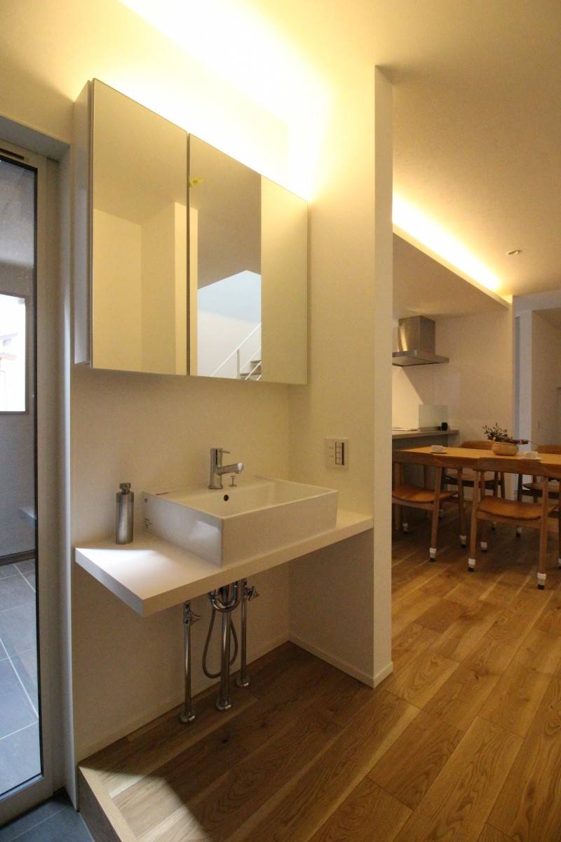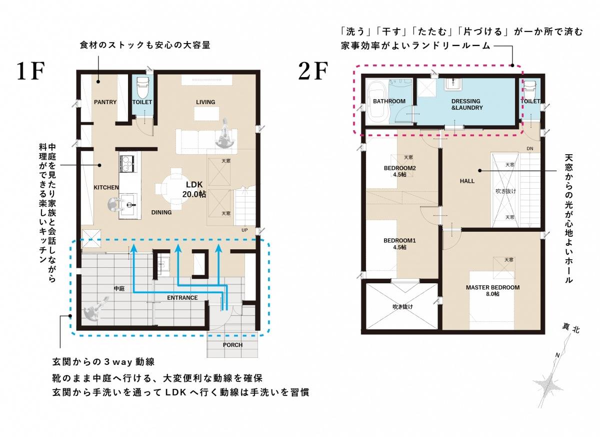 特に洗面室と玄関が繋がっているのは、今後もウイルス感染予防対策に欠かせない間取りの考え方です。外から帰ってきてすぐにうがい手洗い消毒。室内に雑菌を持ち込むことがありません。これからのスタンダードになりそうな動線です。
