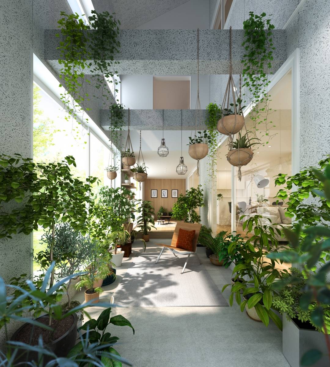 グリーンをテーマにした使い方。吹き抜けの窓からの光をたくさん浴びた植物たちがいきいきと育ち、温室のような空間になります。