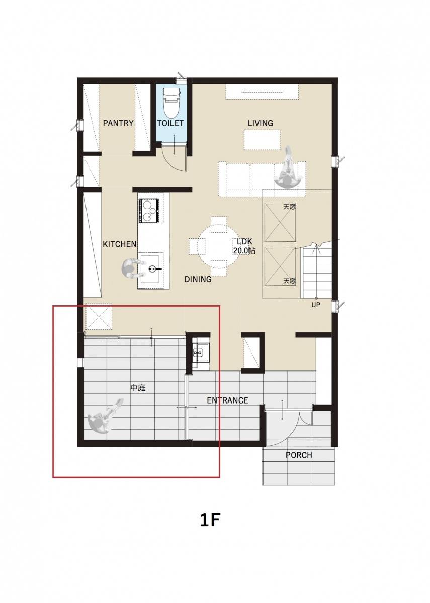 糸島高田の住宅のレイアウト。玄関から直接アクセスできるところに中庭があります。