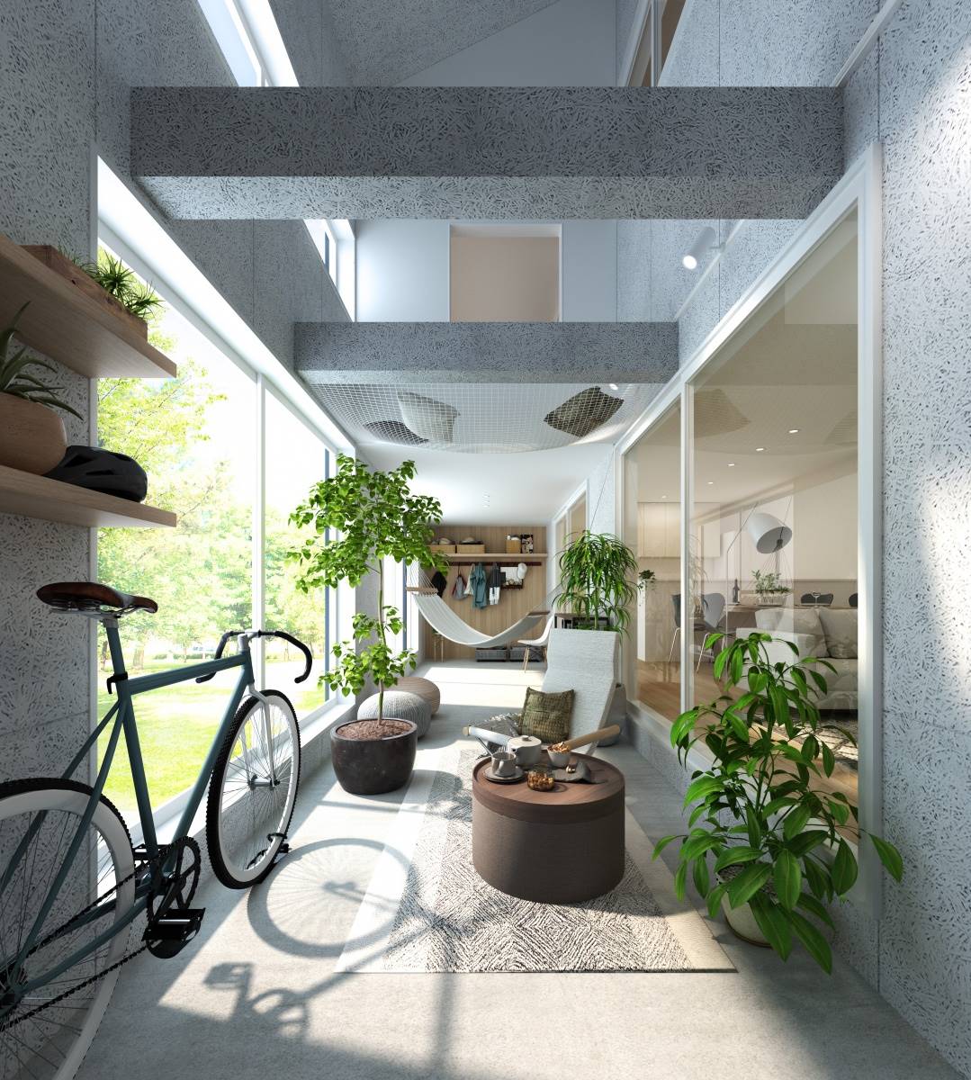 また、福津市日蒔野で展開していたプロジェクトでは、中庭と同じくフリースペースとして使える空間を配置しました。ガレージとして、グリーンハウスとして、セカンドリビングとして、100人いたら100通りの使い方ができる空間をご提案しました。