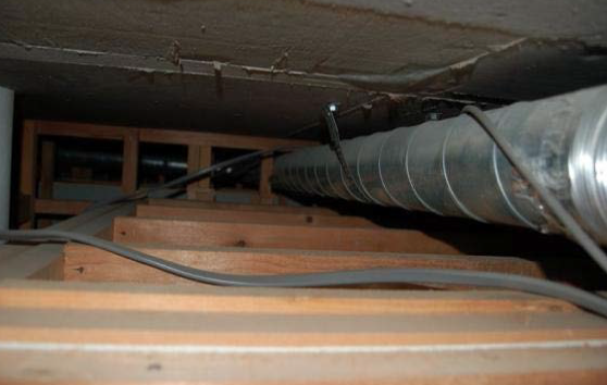 ?浴室の点検口を開けて、浴室と洗面室、トイレがどのような排気経路になっているのかを確認します。それぞれ単独で排気のルートがあるのか、もしくは浴室&洗面室、トイレ、などの二室換気になっているのかの現状を把握し、新しいプランの排気ルートを考えます。また、躯体までの高さも併せて確認します。