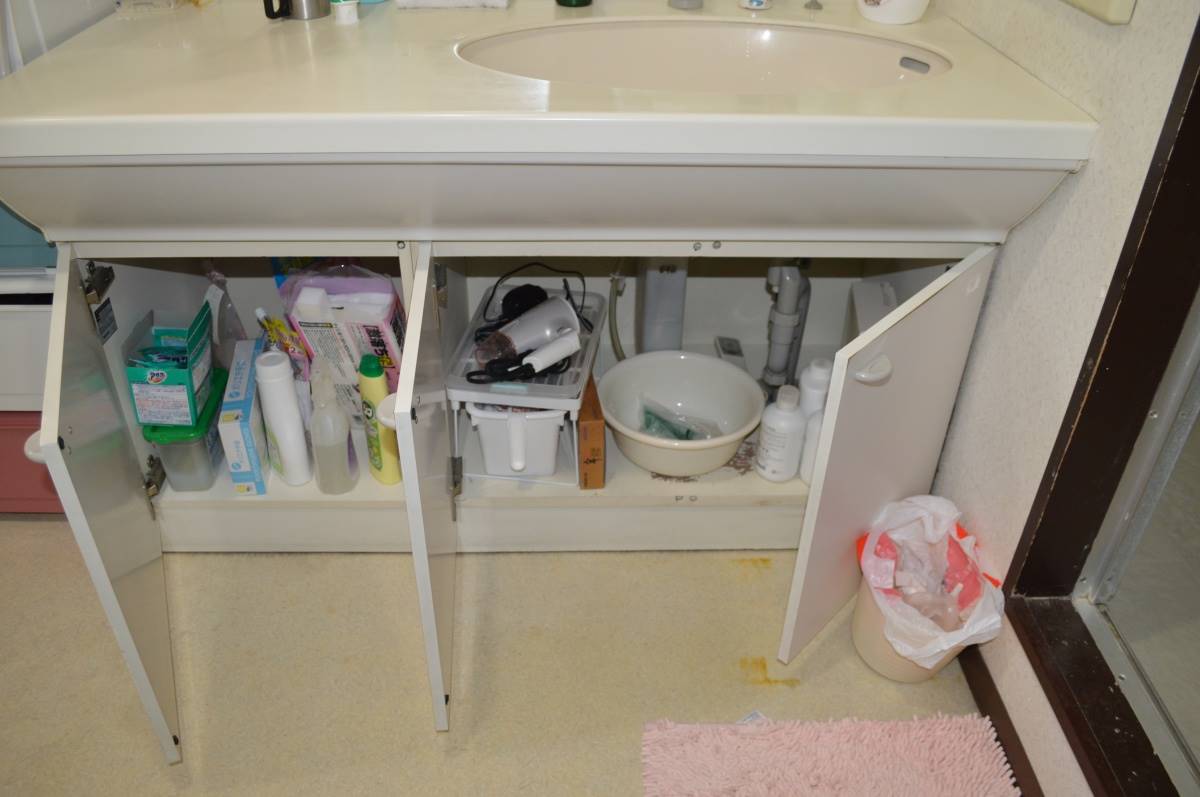 洗面化粧台の周辺も細かくチェック。どんな収納方法をされているか等も含めてチェックし、より快適な収納計画をご提案していきます。