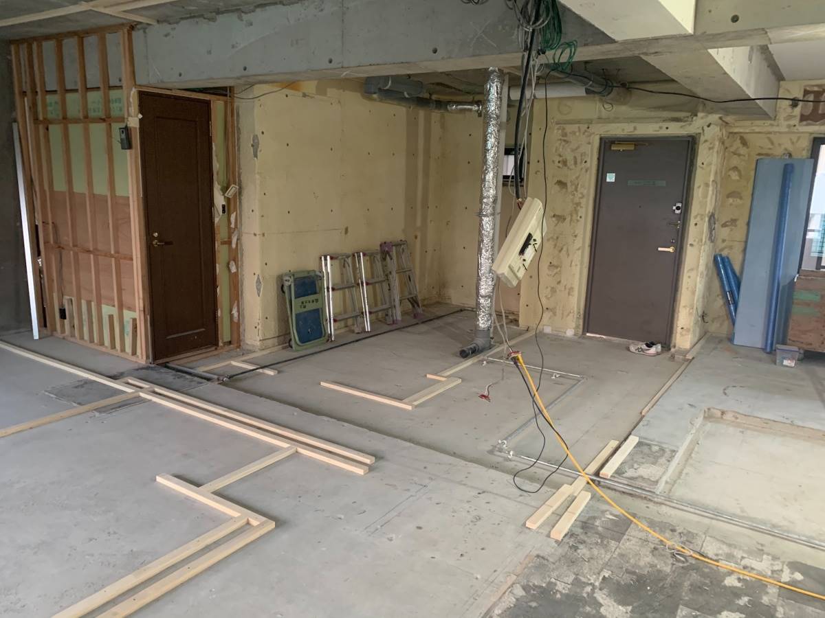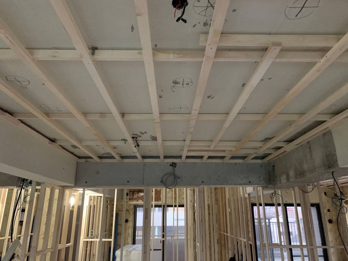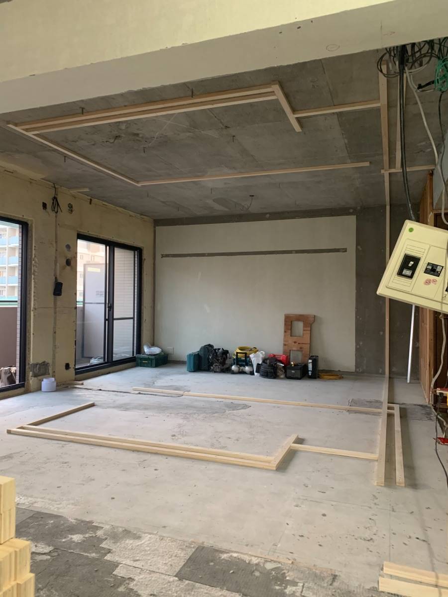 墨出し作業にて基準が決まったら、そこからどんどん壁や天井の木下地を建てていきます。いよいよ工事が始まったなということが目に見えてき始めますね。工事日数はお部屋の広さにもよりますが、平均的に100㎡くらいでだいたい実働で50日くらいかかりますので、約2、3ヶ月間の工事となります。