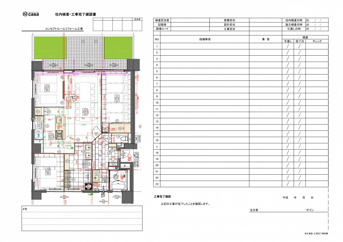 完成前の重要事項として「社内検査」という項目があります。設計や工務に携わったスタッフはもちろんのこと、チームや部署を超えて社内のスタッフが厳しい目で仕上がりを確認し、未施工箇所がないか、不具合はないか、汚れている部分はないか、隅々までチェックしていきます。ガス、電気、水道などのライフラインも確認します。