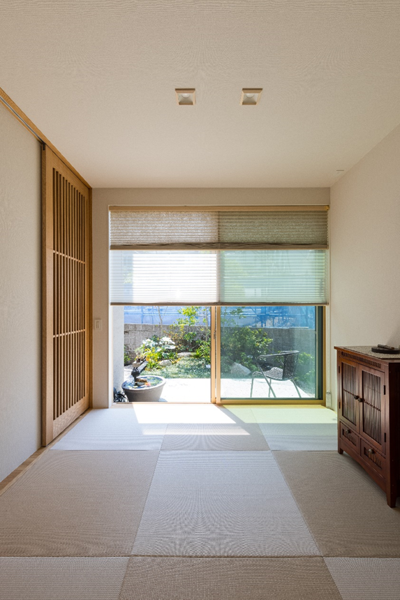 1階には、美しい庭をつながる、季節の移ろいを眺められる和室があり、