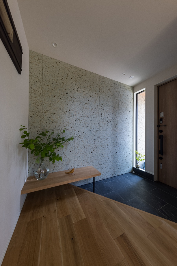 玄関に立つと、根強いファンを持つ、上品かつ主張ある素材「大谷石」が出迎えてくれます。