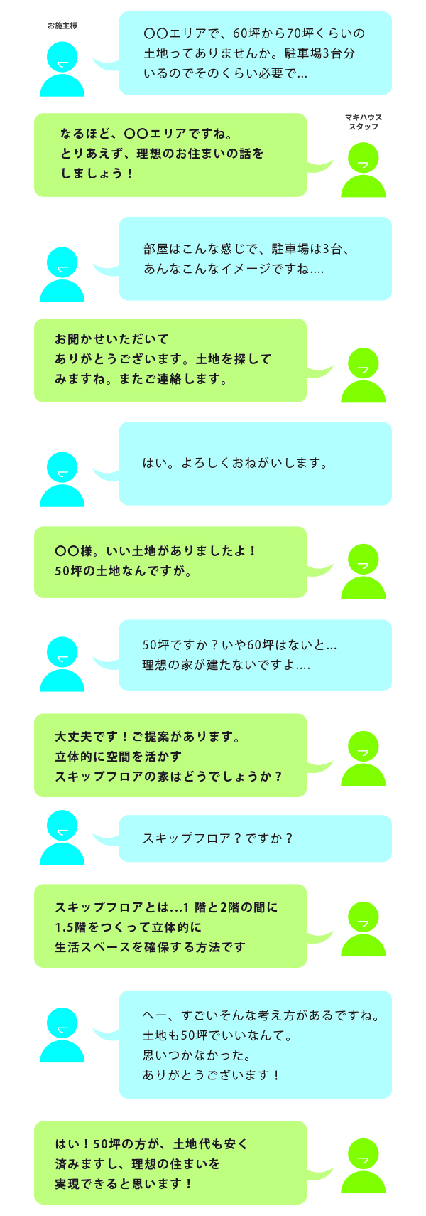当社のお客様でも、そういった方はいらっしゃいます。それでは、実際の当社の提案例をご紹介します。これは、当社のお施主様で実際にあったケースです。このように、60坪ないといけないと思っていたお施主様も、弊社からの提案で、50坪でもスキップフロアというカタチで理想の家を実現できることに気づいていただきました。