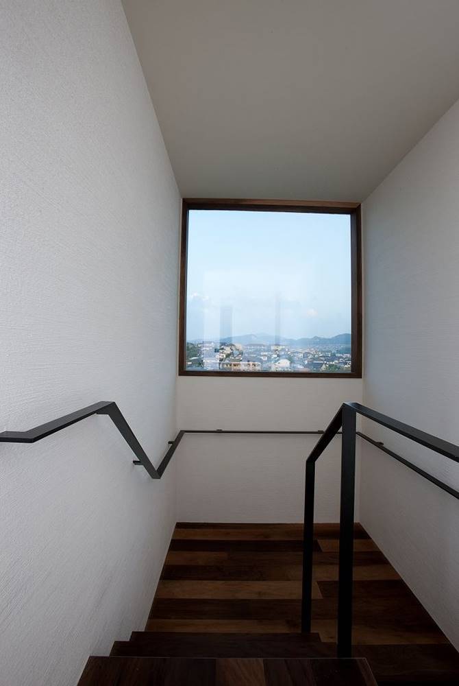 階段の大きな窓は下からの景色と上からの景色がまったくちがう。