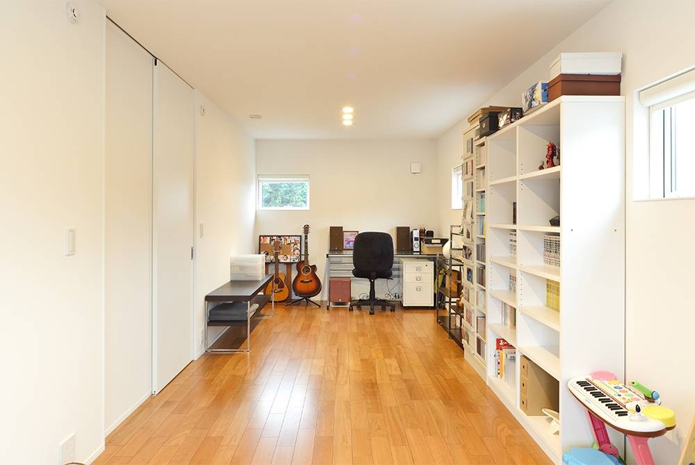 12〜3畳はあるでしょうか。ここは将来子ども部屋にする予定です。いま子どもは2人ですが、3人目も考えています。この部屋を仕切って、3つに分けても1人4帖なので、それで十分かなと。2階のバルコニーには、寝室と子ども部屋の両方から出られるようになっています。バルコニーに格子状の屋根をつけてもらったんですが、「下から見上げたときに、屋根が格子状になっているとかっこいいですよ」と設計士さんから言われ、そうしました。設計時には全然ピンときてなかったんですが、実際に建って、下から見ると、「ほんとだ、かっこいいなぁ」と。