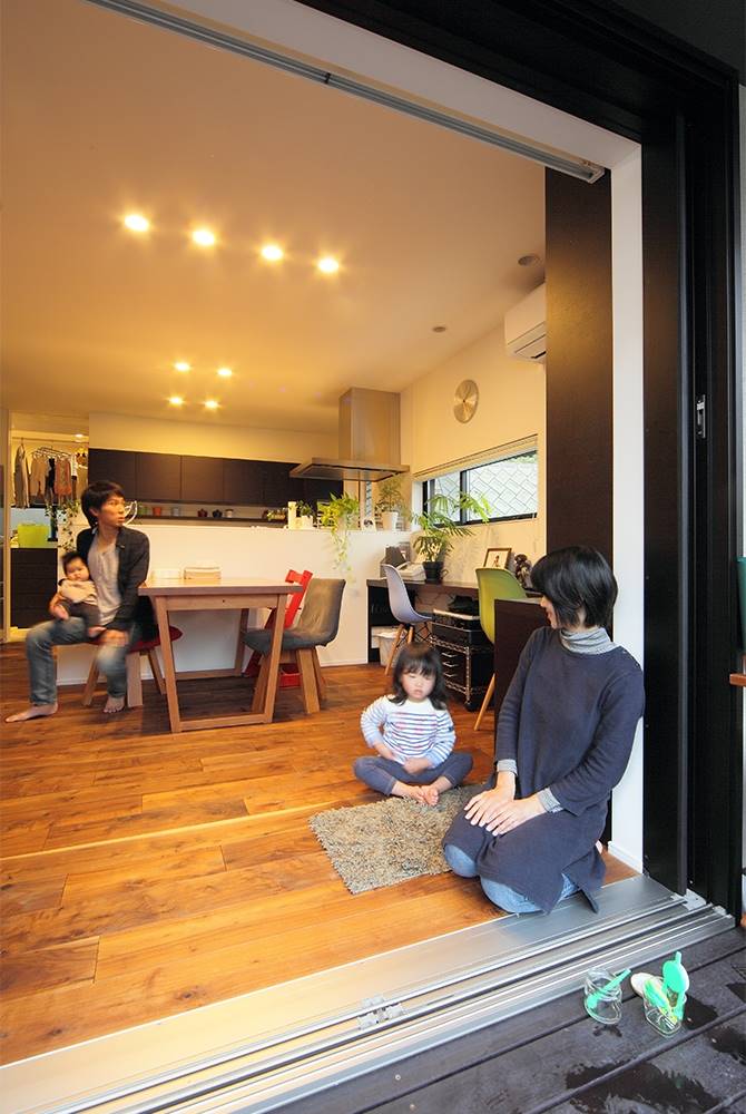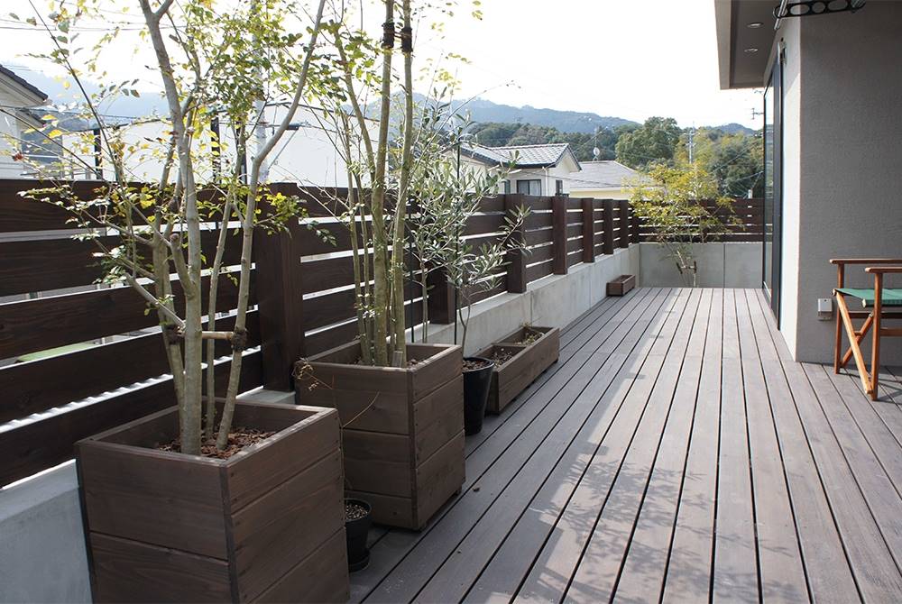 晴れた日はデッキで子どもたちが遊び回っていますよ。長女はここで飛ばすしゃぼん玉がお気に入りですね。縁側にしようかとか、庭を作ろうかとか、いろいろ考えたんですが、最終的にデッキにして良かったです。土地が少し高台になっていますし、この先が行き止まりで人や車もあまり通りませんので、人の目線も気にしなくていいんですよ。土地も一緒に依頼して、土地のご担当者の方から何十カ所と連れて行ってもらいました。最終的にこの土地が見つかったんですが、いい場所を探してもらったなと思っています。