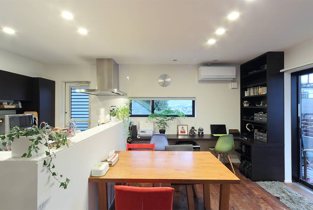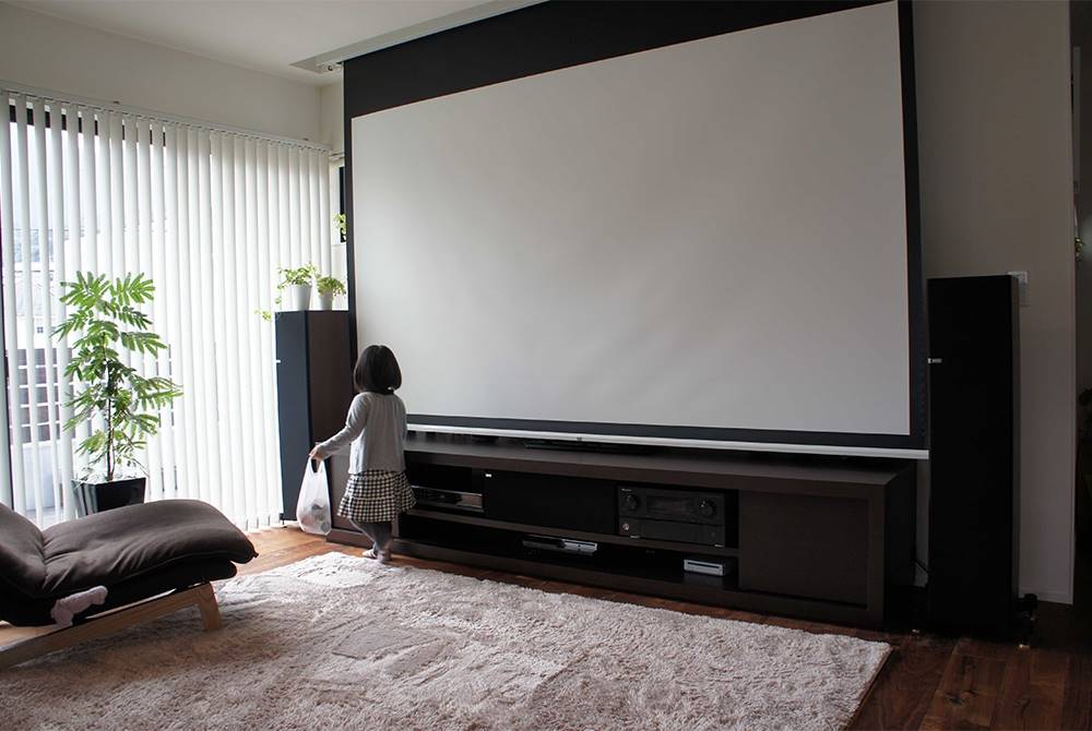 (ご主人)私は映画が好きで、WOWOWなどで放映される映画をブルーレイによく録画するんです。実はリビングはホームシアターにもなっているんですよ。テレビの前にスクリーンが降りてきます。ホームシアターを作ることも最初の要望の1つでした。マキハウスは過去にホームシアターのお店と一緒に空間づくりをされていたということで、設計士さんに直接やりとりしてもらって希望を叶えてもらいました。テレビとブルーレイの台は造り付けの家具です。ホームシアターの機械を将来買い替える場合のサイズなども考えて造ってもらいました。配線を見えないように隠してほしいというのは妻の要望で…。