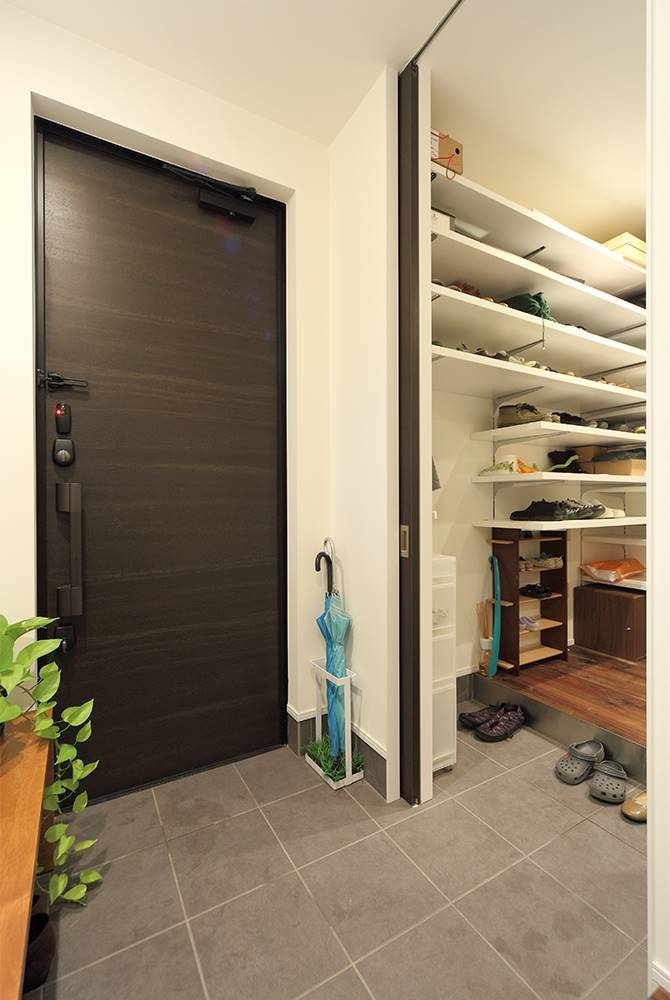 家族みんなでお風呂に入りたいと思って、みんなで脱衣所にいても苦しくないようにしてほしいというのが要望の1つでもありました。洗面台も大きめのもので、家族並んで歯が磨けますよ。収納は造り付けで、タオルや家族の下着はここに収納しています。アイロンをかけるスペースも造っていただきました。洗濯物は、この家事室内に部屋干しもできるんですよ。玄関は、来客用の上がり口と、家族用の上がり口、両方作ったのですが、この家事室は家族用の玄関に直接行けるようになっています。玄関にはシューズクローゼットだけでなく、洋服を収納するクローゼットも造っていただき、収納力は抜群です。子どもたちの洋服はほとんどここに収納しています。夫婦の部屋着も収納していますので、2階の寝室にわざわざ着替えに上がる必要はないんですよ。動線はほんとに便利です。