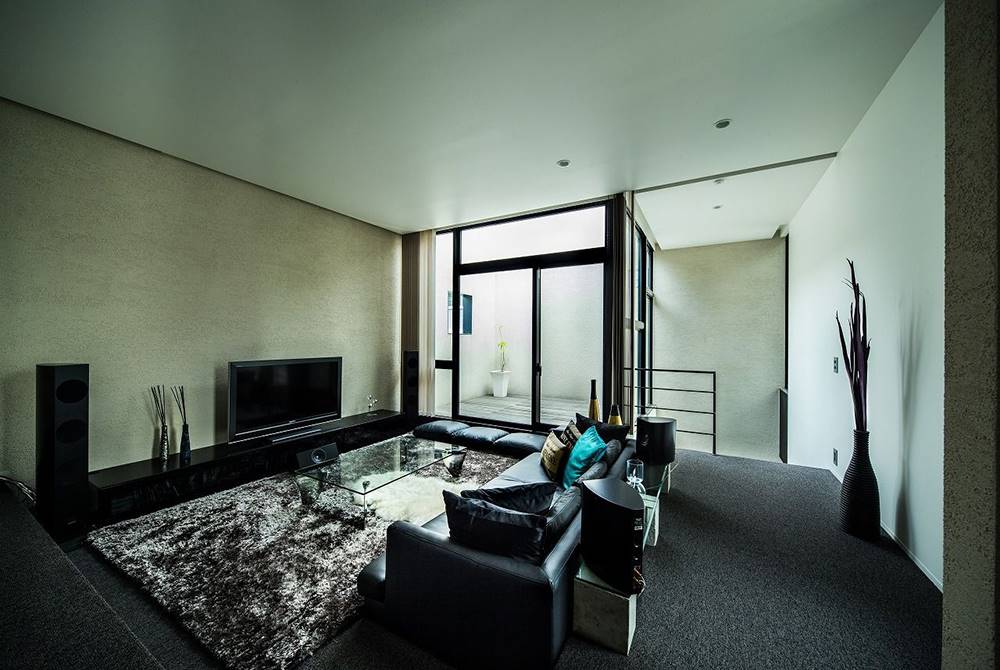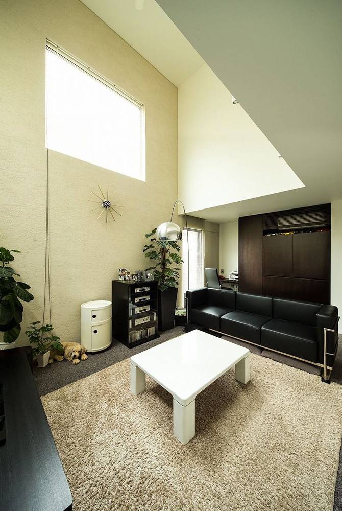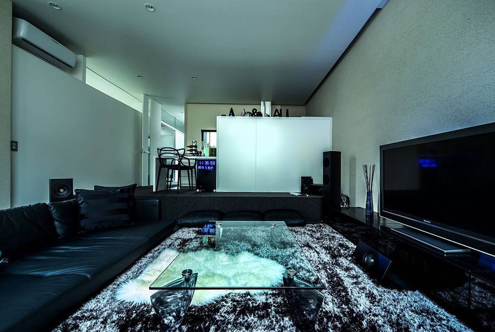 (息子さん)最近ではオープンキッチンが多いですが、私はリビングとキッチンの境目が欲しかったんです。キッチンって雑多なものがいろいろありますし、リビングからそれが見えてしまうのが好きじゃなくて。それで収納建具を置きました。これだったら飽きたときには取り外しもききますしね。あとはリビングに段差が欲しかったですね。「埋もれる」ような感じと言うか、そういう空間にいると安心感がありますよね。もともとソファは置かずに、クッションを敷き詰めて、リビング自体を一つの大きなソファのような感じにしてもいいな、と思いましたが、結局ソファを置くことに。普段はここで寝転びながら映画を観ていますよ。より広く感じさせるために家具の背丈を低くしたかったので、ソファの足を取り外しました。ローボードも「機材が入りませんよ」と反対されたにもかかわらず、「高さ30センチで作ってください」と無理を言いました。そしたら案の定機材が入らなくて…。マキハウスの言う通りにしておけば良かった(笑)。