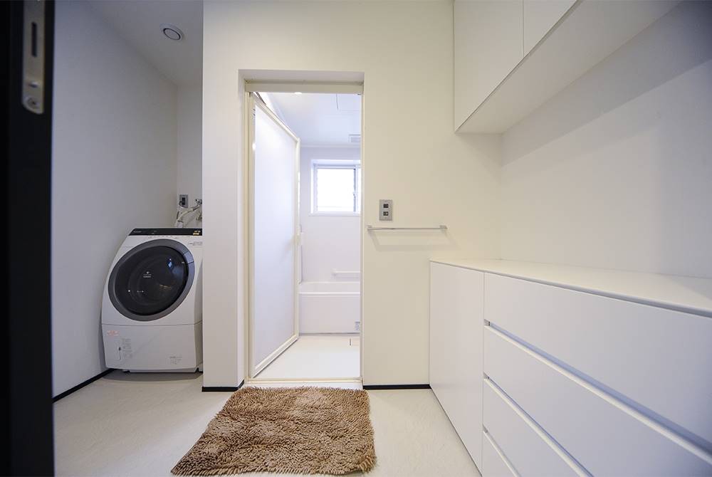 シューズクローゼットの先に、ちょっとした納戸を造りました。いろいろと物が置けて便利ですね。一部洋服のクローゼットにもなっています。娘がクラシックバレエの教室に通っているのですが、帰ってきたらそこで着替えをさせているんですよ。家事室は、浴室の脱衣所にもなっていて、洗濯機や下着を入れる収納タンスなどを置いています。洗濯物が干せるスペースを作ってもらったのがよかったです。収納タンスの上はアイロンがけの場所にもなっています。