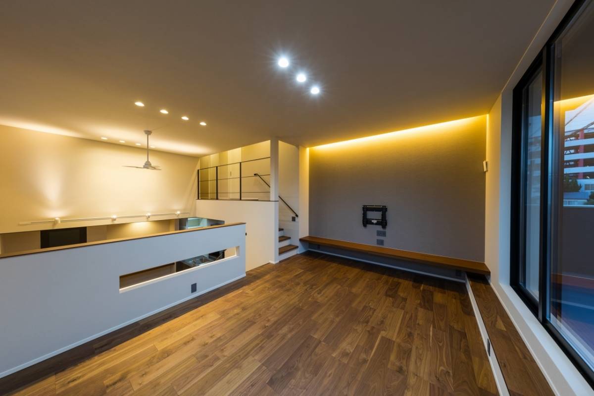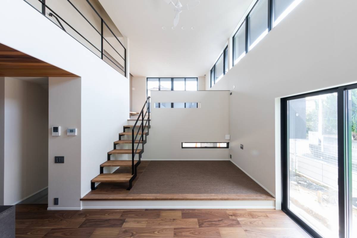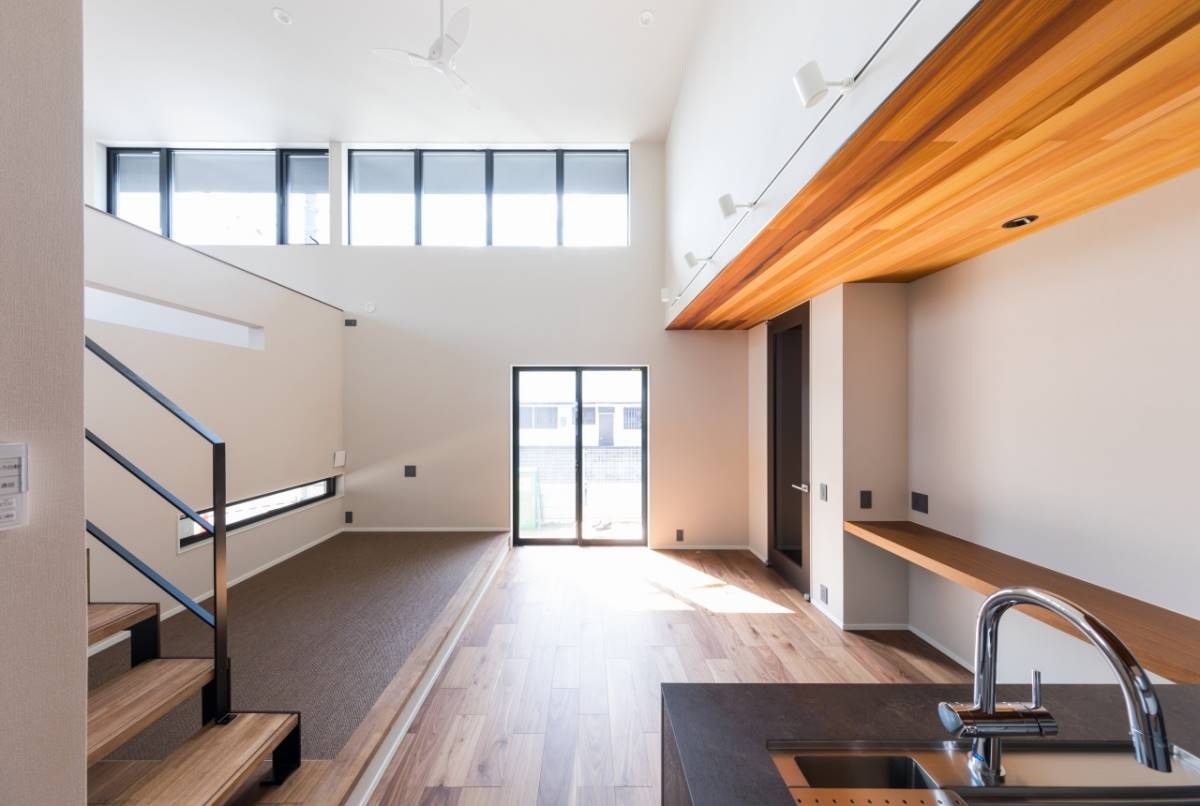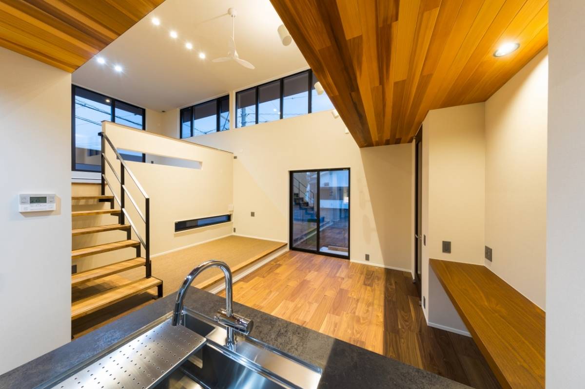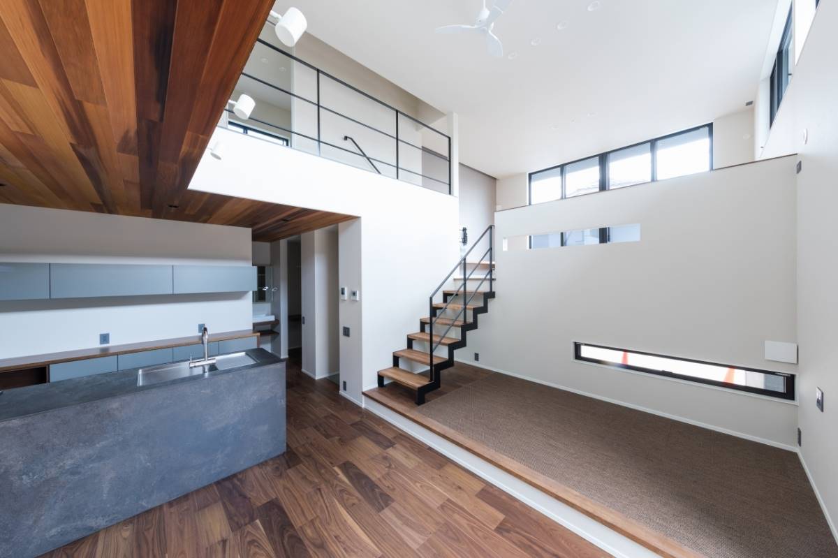 1階の外にはガレージ、屋内には玄関から表動線と裏動線でつながるダイニング。キッチン中二階には、ダイニングと空間で縦に繋がるリビング。さらに上には、子供部屋と寝室。空間の持つポテンシャルを十二分に発揮したスキップフロアの住まいです。ダイニングスペースの横には、畳のスペースもあり、ちいさなお子様であればそこに寝かせたり、遊ばせたりしながら家事ができます。また、ガレージから屋内への動線はキッチンへと続き、買い物したものを最短距離で運べる。そんな様々な箇所でとても機能性に溢れた間取りの家です。