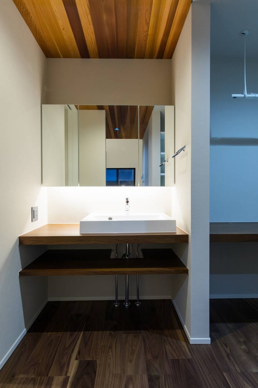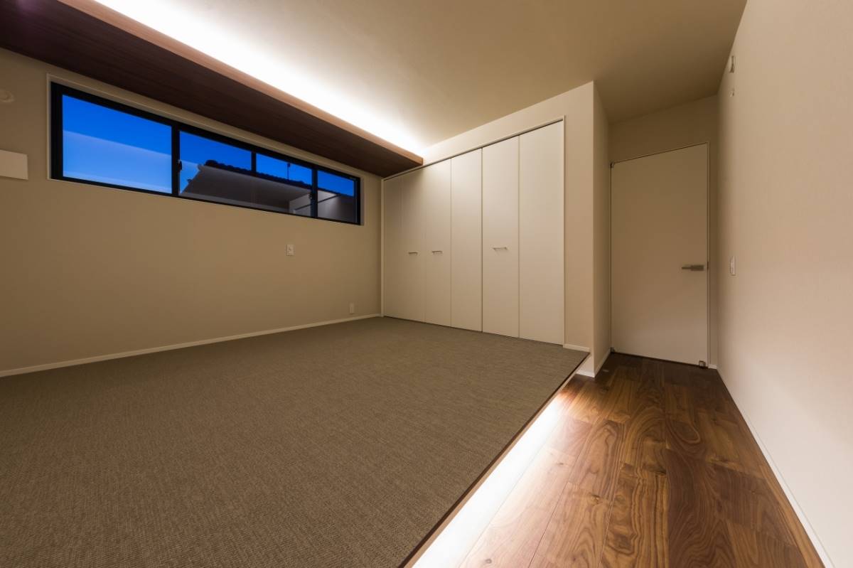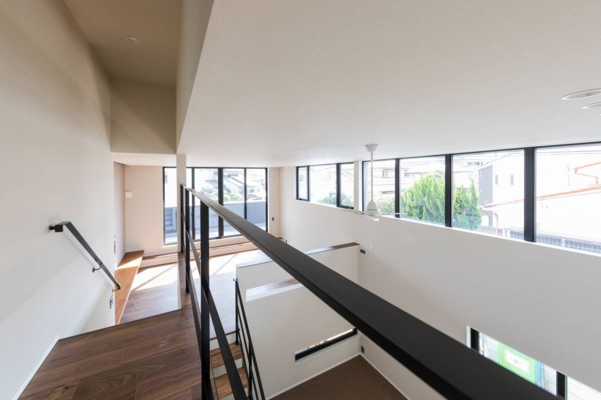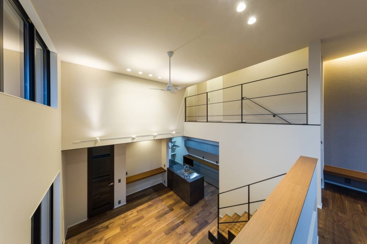 1階の外にはガレージ、屋内には玄関から表動線と裏動線でつながるダイニング。キッチン中二階には、ダイニングと空間で縦に繋がるリビング。さらに上には、子供部屋と寝室。空間の持つポテンシャルを十二分に発揮したスキップフロアの住まいです。ダイニングスペースの横には、畳のスペースもあり、ちいさなお子様であればそこに寝かせたり、遊ばせたりしながら家事ができます。また、ガレージから屋内への動線はキッチンへと続き、買い物したものを最短距離で運べる。そんな様々な箇所でとても機能性に溢れた間取りの家です。