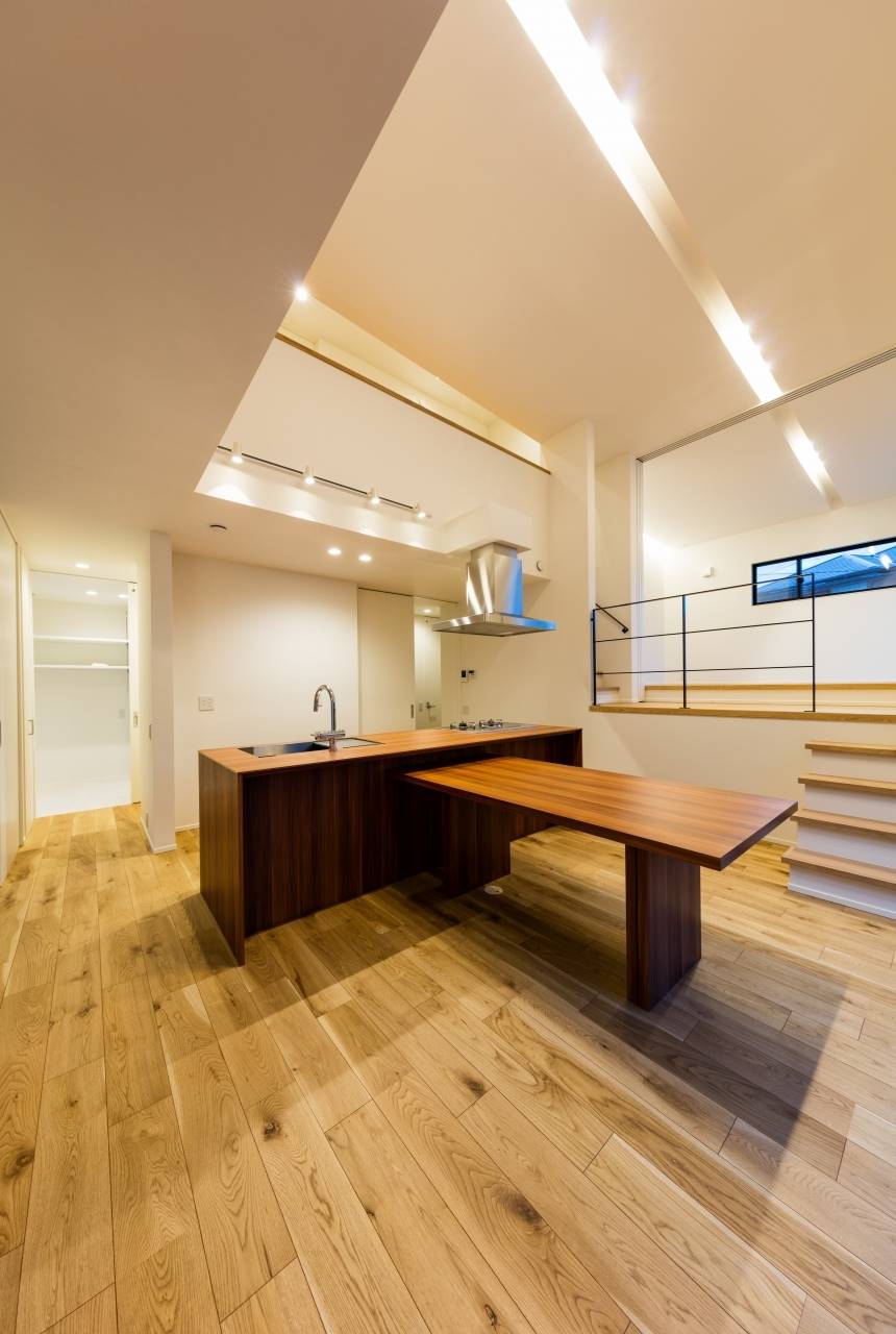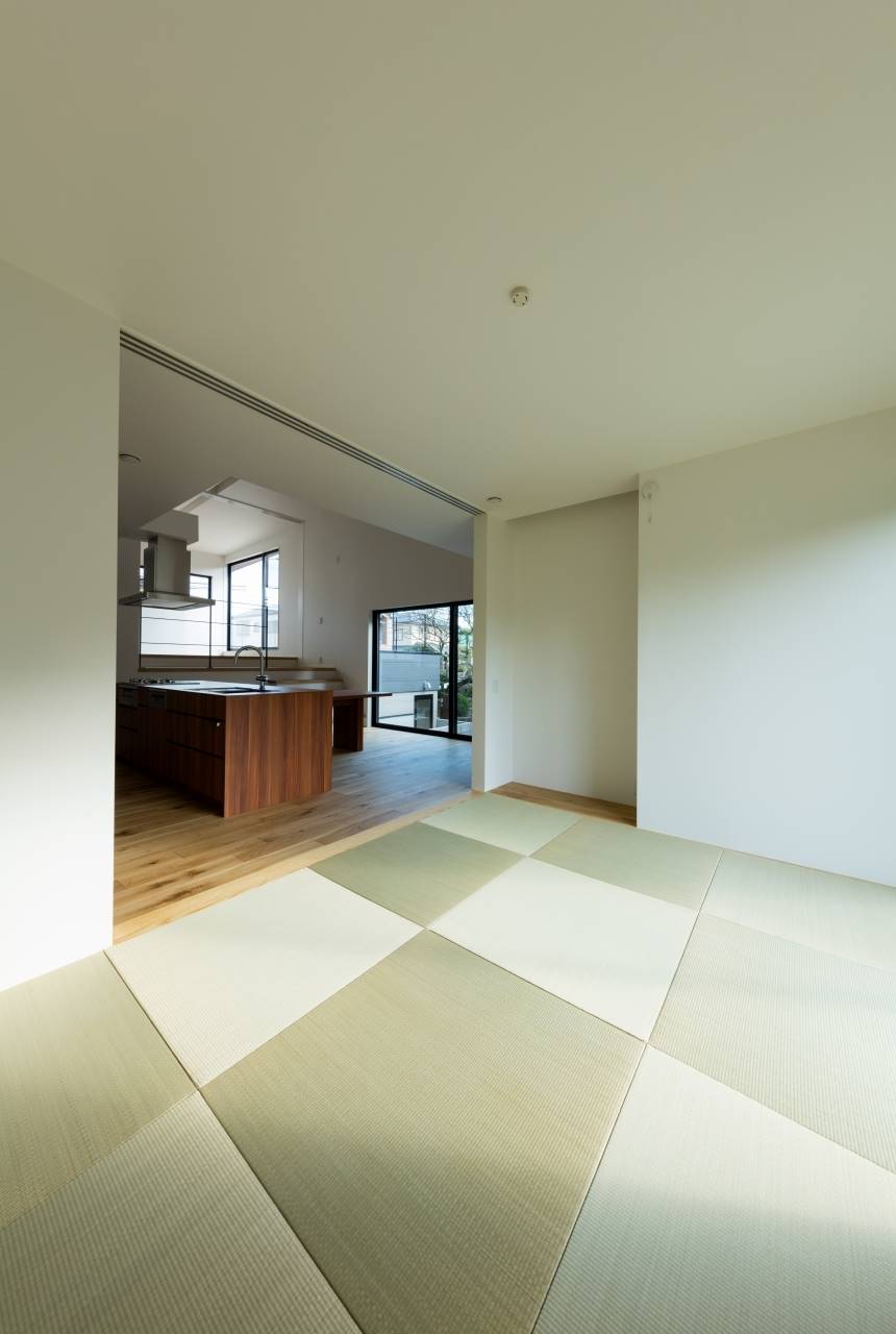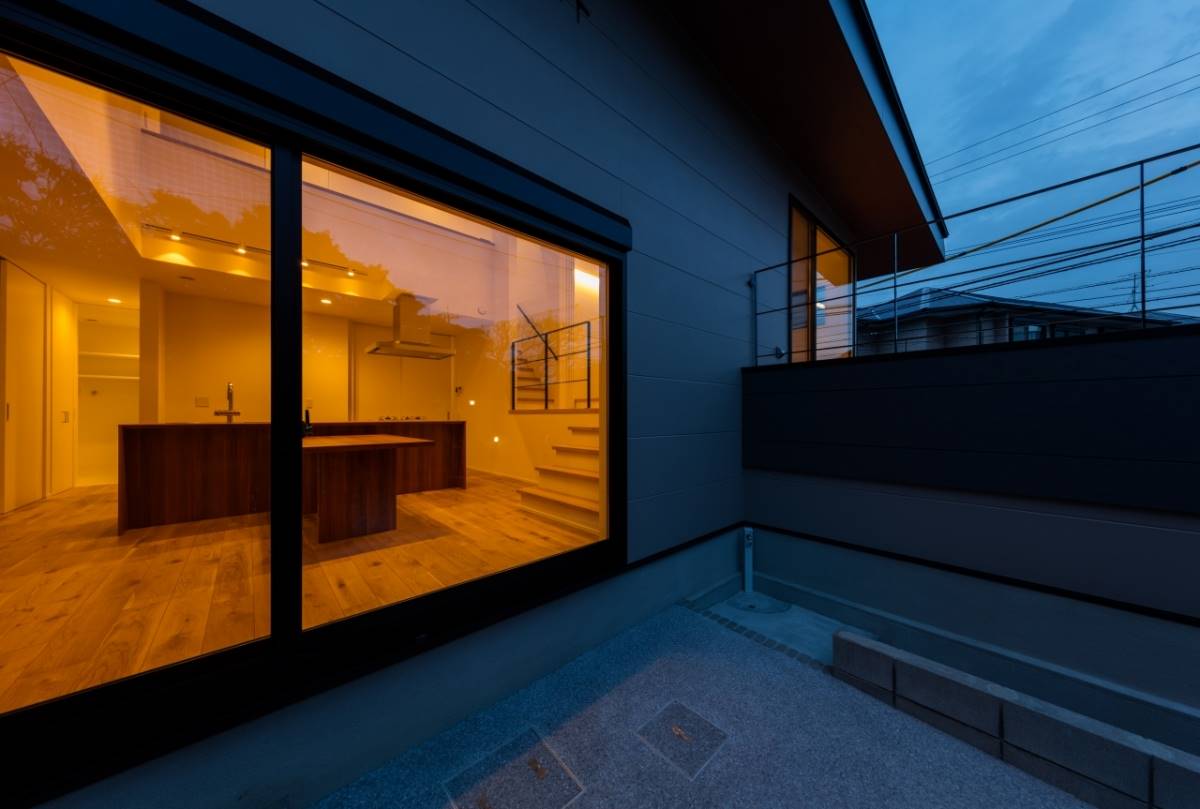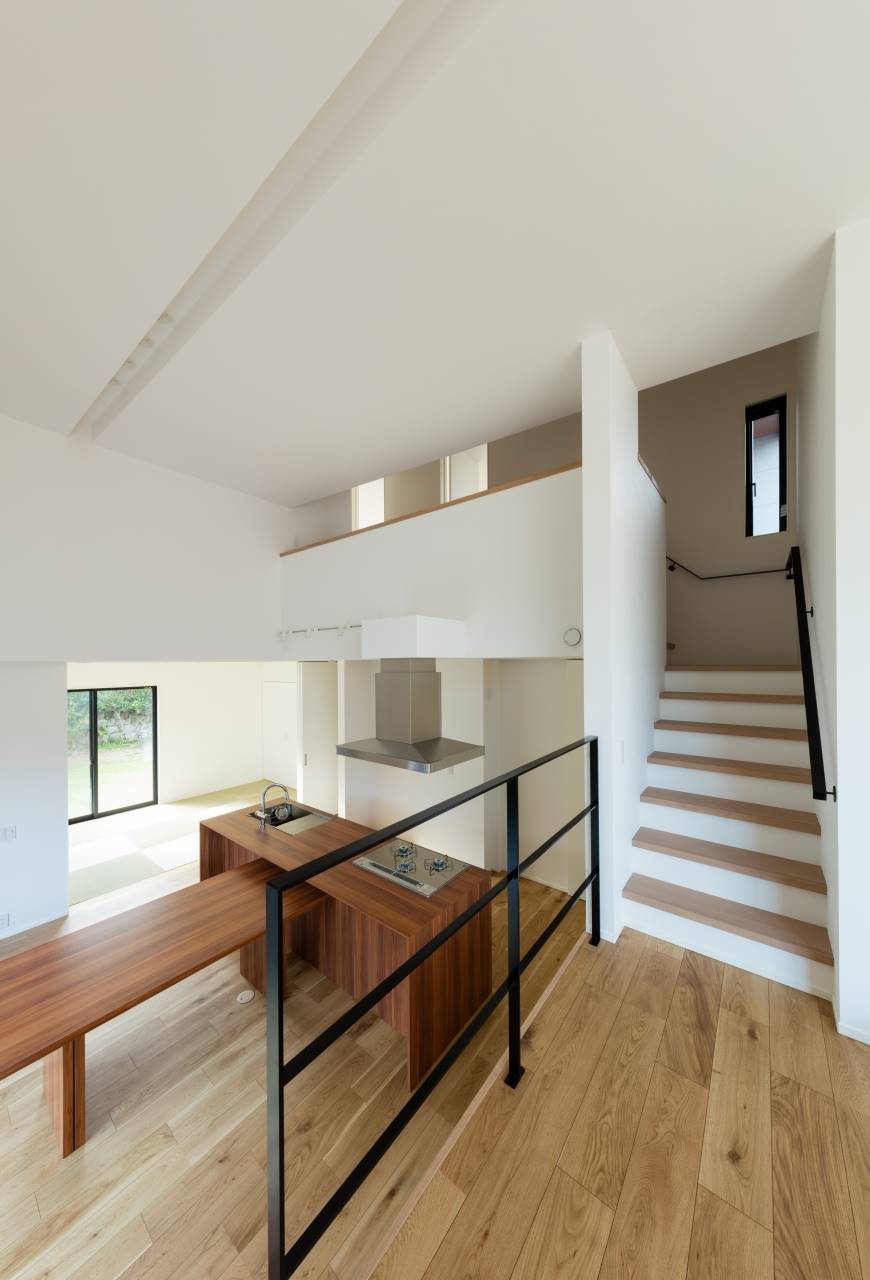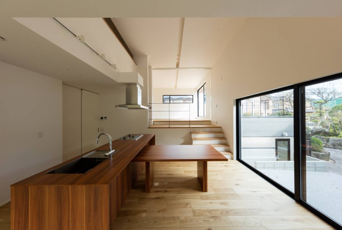美しい庭を持つ母屋の隣に、新しい住まいは完成しました。母屋側に大きな開口をとることで、その美しい庭を共有することができました。キッチンから料理しながらも見えるし、ダイニングで家族揃っての食事の時も常に美しい庭が横にある生活。また1階はほぼひとつながりのスペースなので、とても開放的でリラックスできます。